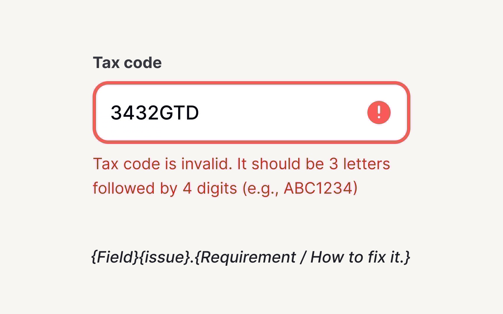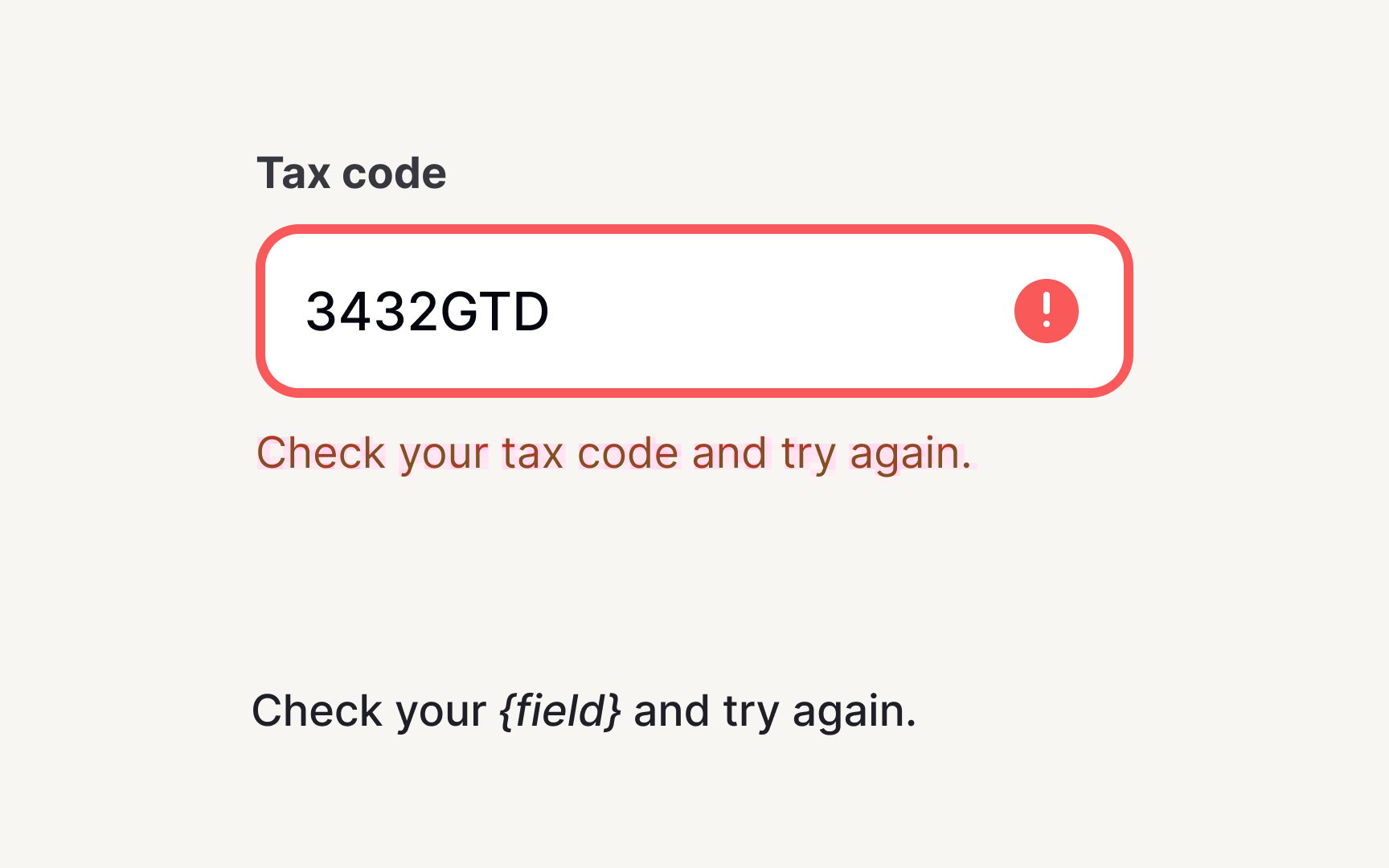 Build your error message framework around 3 components: what happened, why it matters, and what to do next. Create templates like "[Problem]. [Impact]. [Solution]." For example: "The code you entered doesn’t match. Didn’t get the code? [Resend code].”Document variations for different severity levels and contexts.