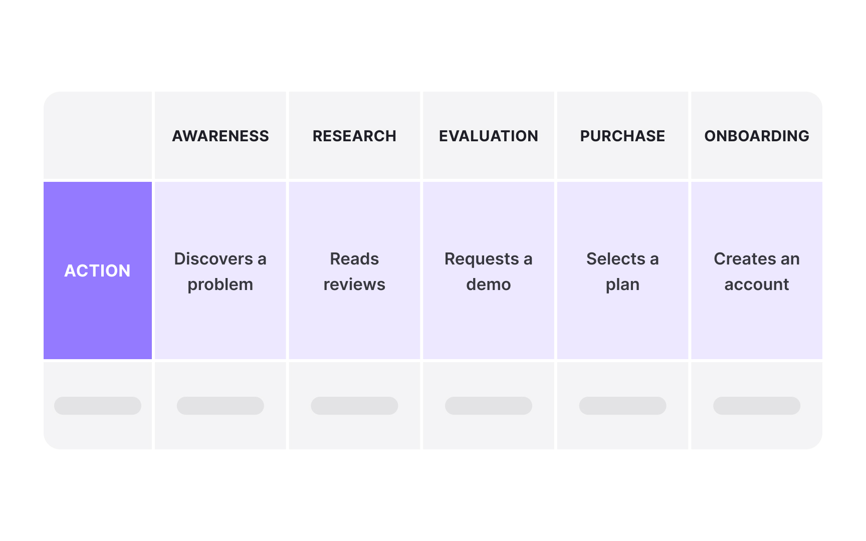 Effective action descriptions use present tense and active voice to create immediacy. Instead of "Payment was processed," write "Processes payment." Keep each action concise, typically 3-5 words, making them scannable at a glance. Group related actions into logical stages that reflect natural breaks in the customer journey.