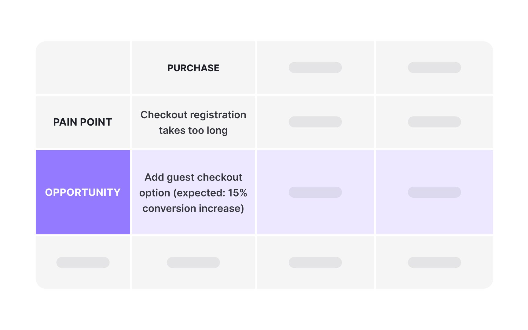 Generate opportunities by directly addressing pain points and unmet needs revealed in other layers. When thoughts show confusion, the opportunity might be clearer information architecture. When emotions dip during waiting periods, consider adding engagement elements. Strong opportunities are specific, feasible, and measurable. Instead of "Improve checkout," write "Reduce checkout steps from 5 to 3" with expected impact metrics.