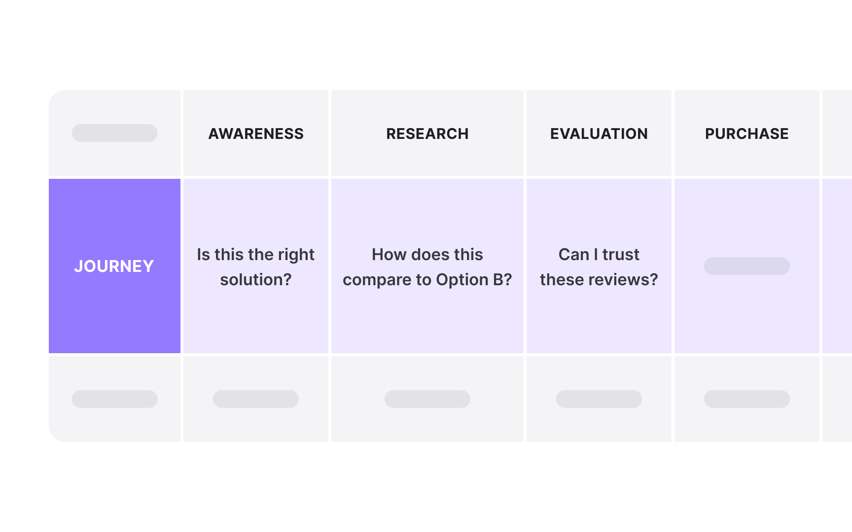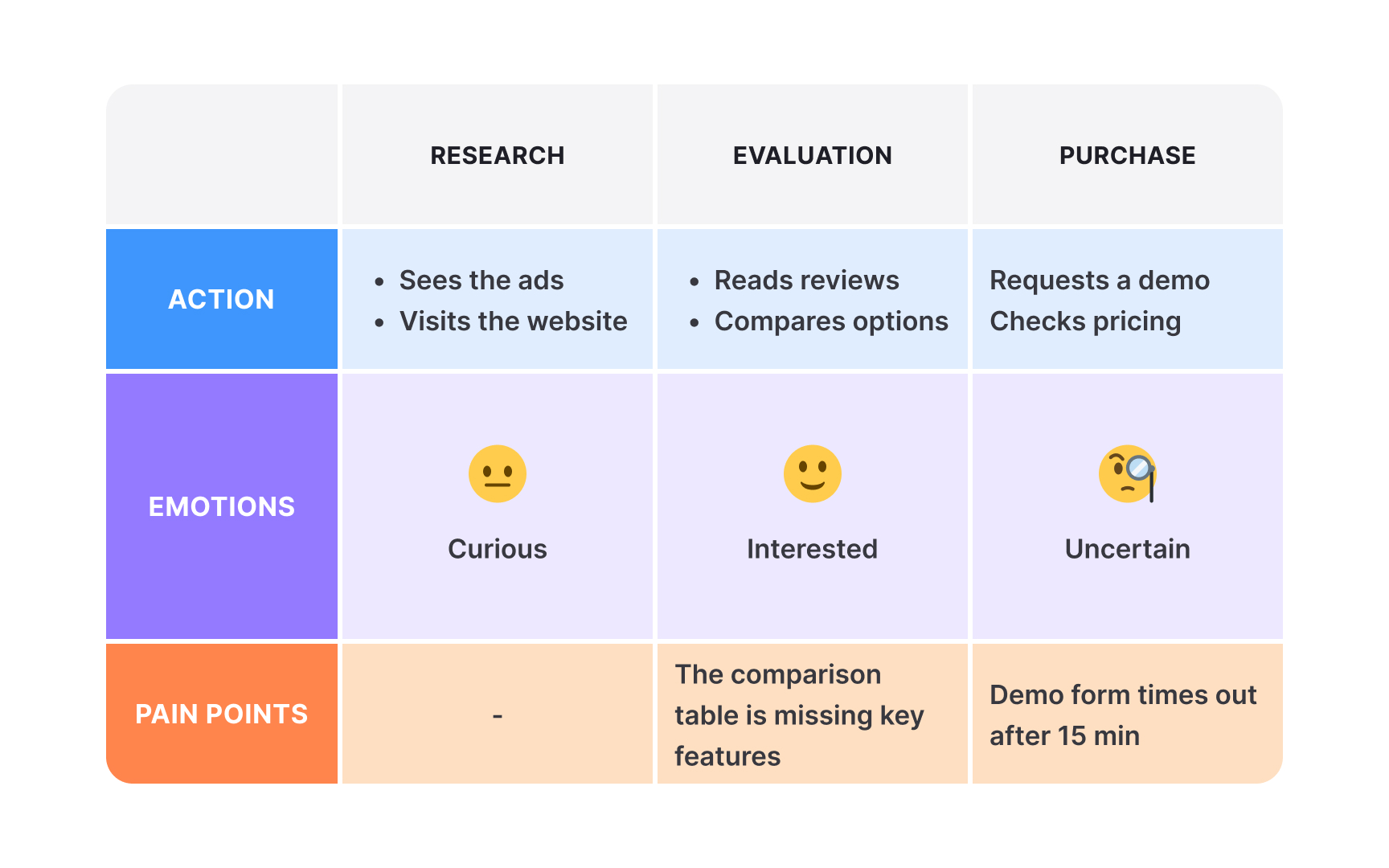 The granularity of actions depends on your map's purpose. Macro maps, used for strategic planning, might show broad actions like "Researches solutions." Micromaps, meant for operational fixes, break this down into steps like "Reads blog posts," "Downloads comparison guide," or "Watches demo video." Match the granularity to your audience and the decisions they need to make.