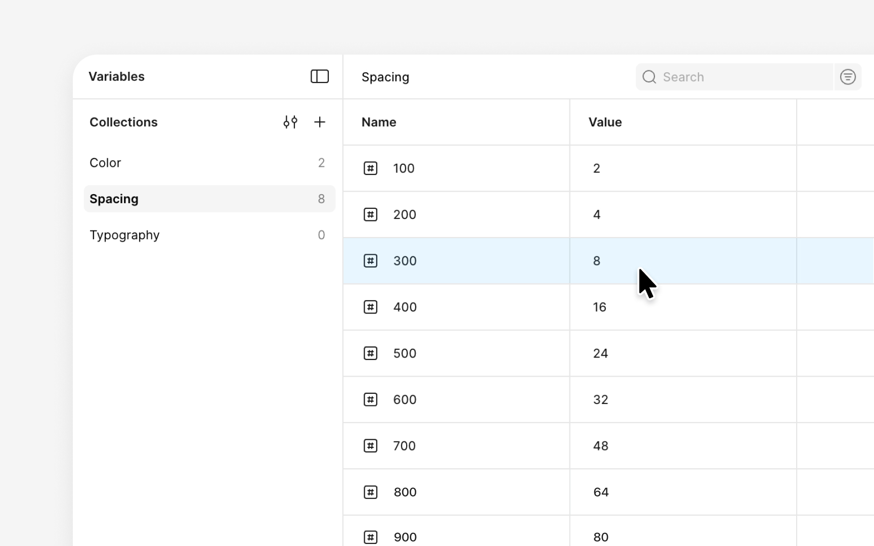 A spacing scale becomes much easier to use when it is implemented as a set of variables. In Figma, this begins by creating a collection dedicated to spacing. Each value is added as an individual variable, often built from a base unit using clear, predictable increments such as 2, 4, 8, 16, 24, 32, 48, and 64. These values are typically named in a numeric sequence like spacing-01, spacing-02, or spacing-03, which keeps the scale ordered and easy to scan. This forms the set of raw spacing values.