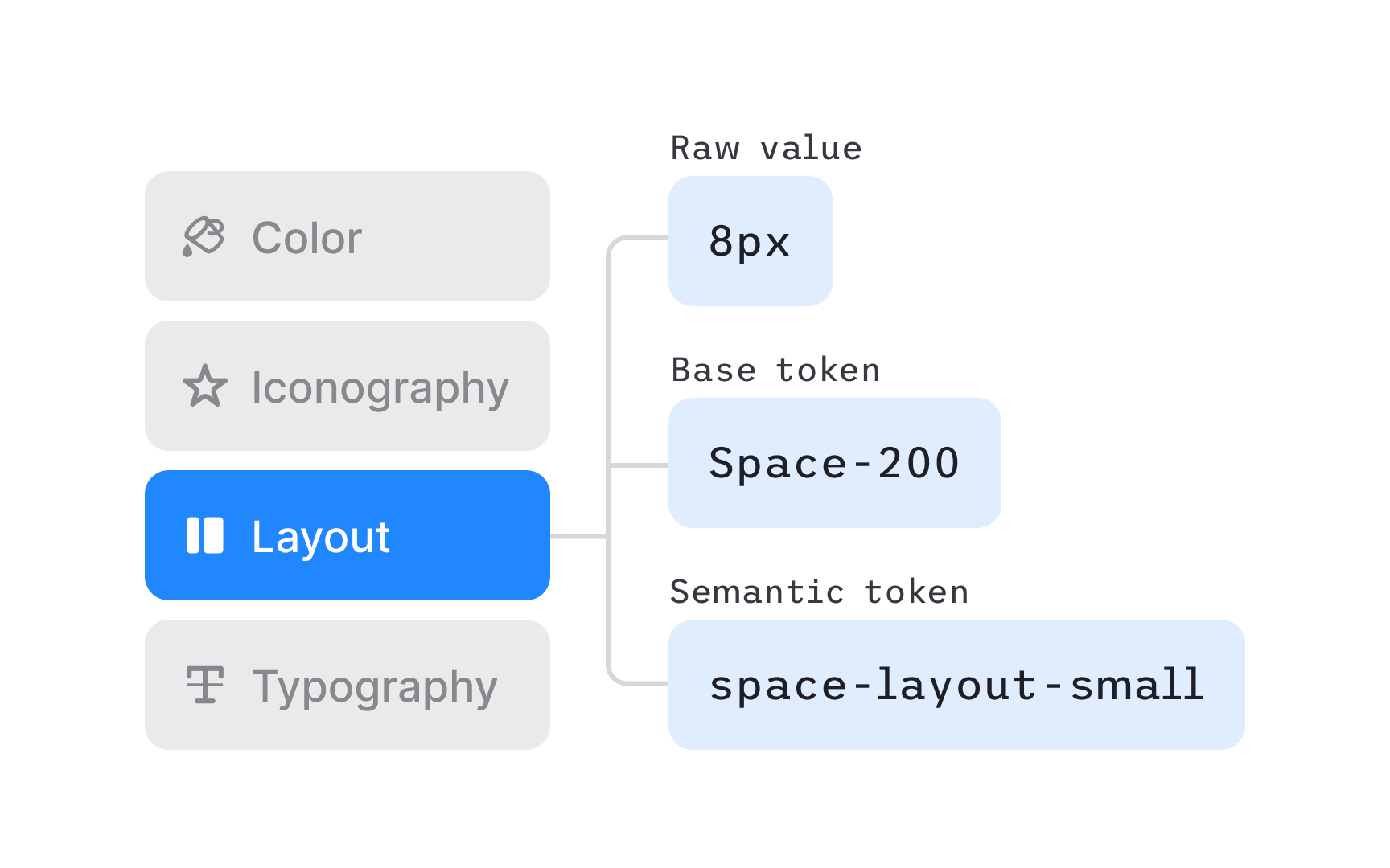Building a token structure starts with defining a clear hierarchy that moves from broad foundations to specific applications. For example, for colors, this usually begins with option tokens, which describe all available blue-100, blue-200, or grey-900. These raw values serve as the visual building blocks for the system.