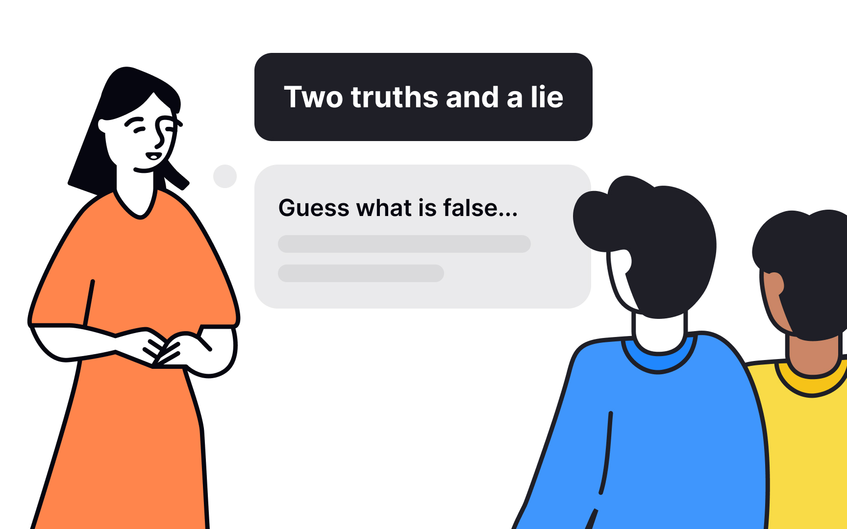 - Two truths and a lie: Participants share 3 statements about themselves, two of which are true and one false, and the group has to guess the lie.