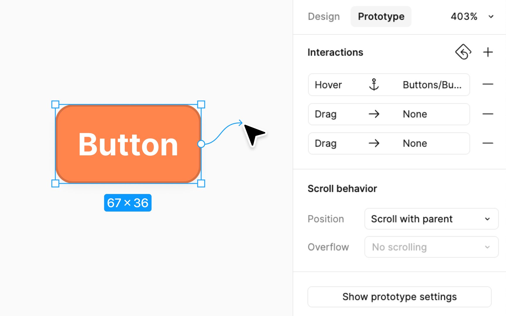 Additionally, you can add interactions directly on the canvas in the Prototype panel by clicking and dragging to create connections between objects.