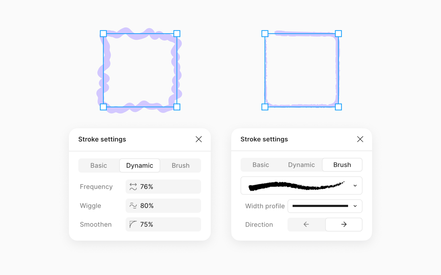 Figma's Dynamic and Brush Strokes are found under the Advanced stroke settings in the Stroke section of the Design panel. When you click this icon, a panel opens with 3 tabs at the top: Basic, Dynamic, and Brush.