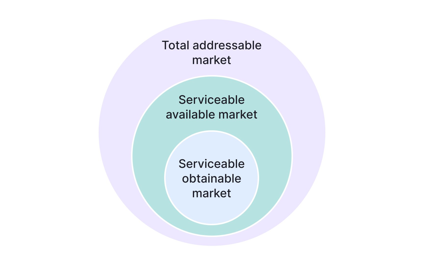 Most products target a subset of TAM called SAM (Serviceable Addressable Market), which considers geographic and regulatory constraints. Your SOM (Serviceable Obtainable Market) is the realistic portion you can capture given competition and resources.[1] These calculations guide investment decisions and growth projections.