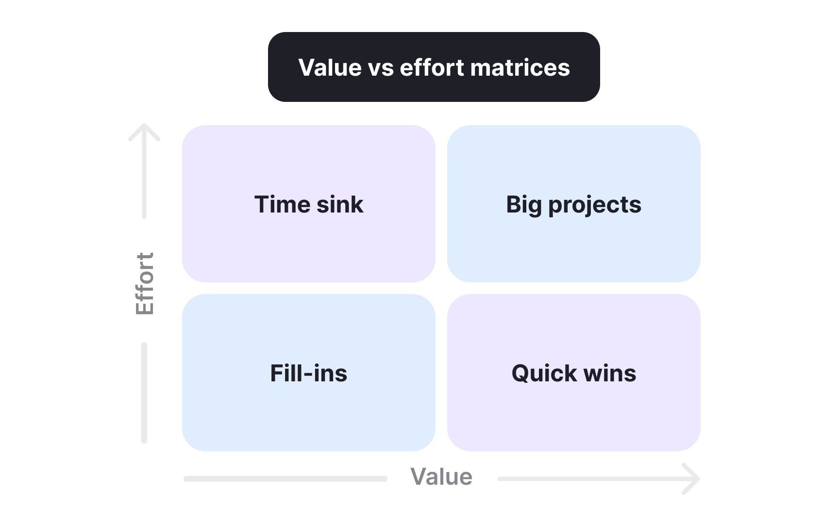 Value vs. effort analysis helps teams identify quick wins and avoid resource traps. By plotting