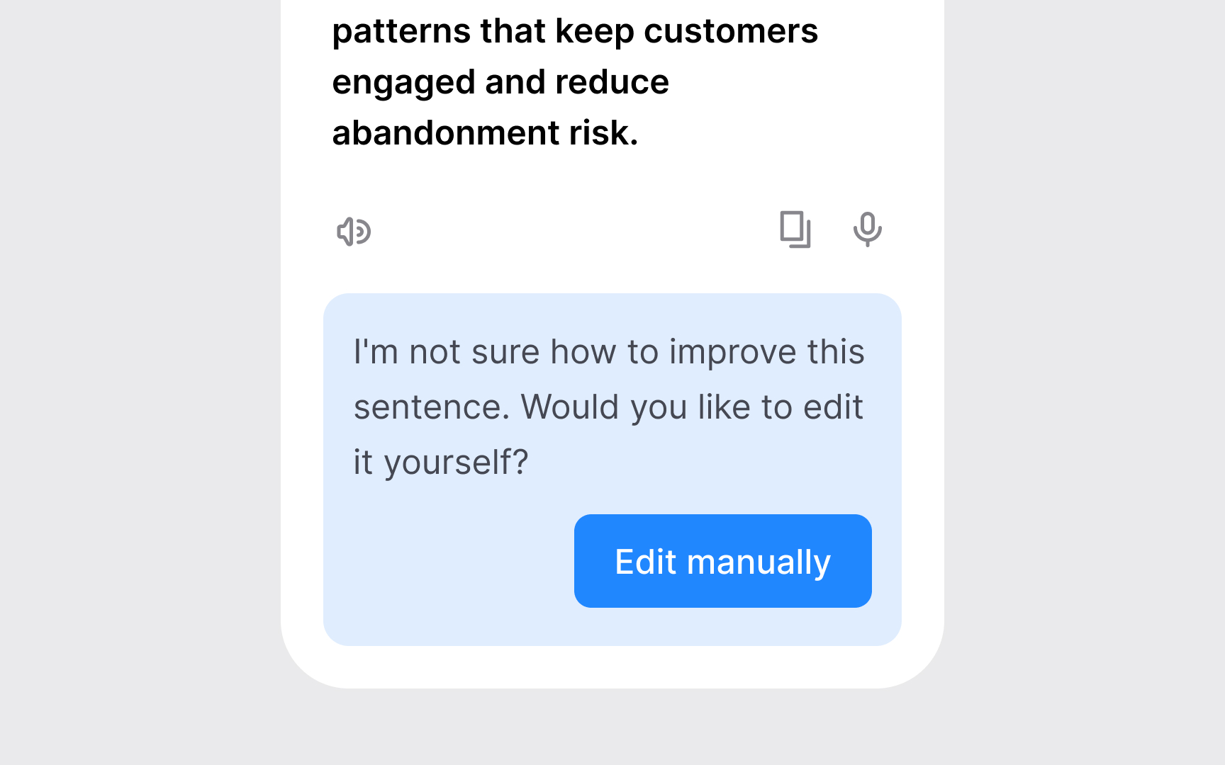 Graceful failure means always providing a path forward. When AI can't complete a task, offer a manual alternative. A writing assistant might say "I'm not sure how to improve this sentence. Would you like to edit it yourself?" This keeps users productive while collecting valuable feedback. The system admits its limitation and immediately offers a solution.