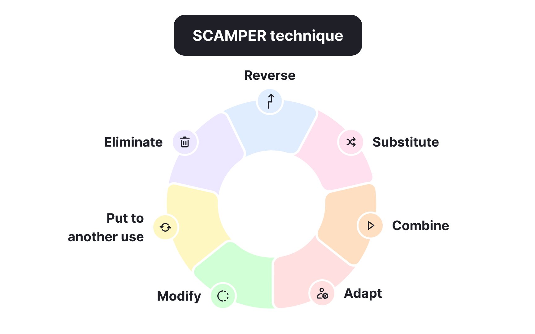 SCAMPER is a framework that helps teams create new ideas by asking 7 types of questions about existing products and services. Instead of waiting for inspiration, it gives a method to look at things differently and spark innovation. The goal is not always to invent something completely new, but to see how changes can add value, improve