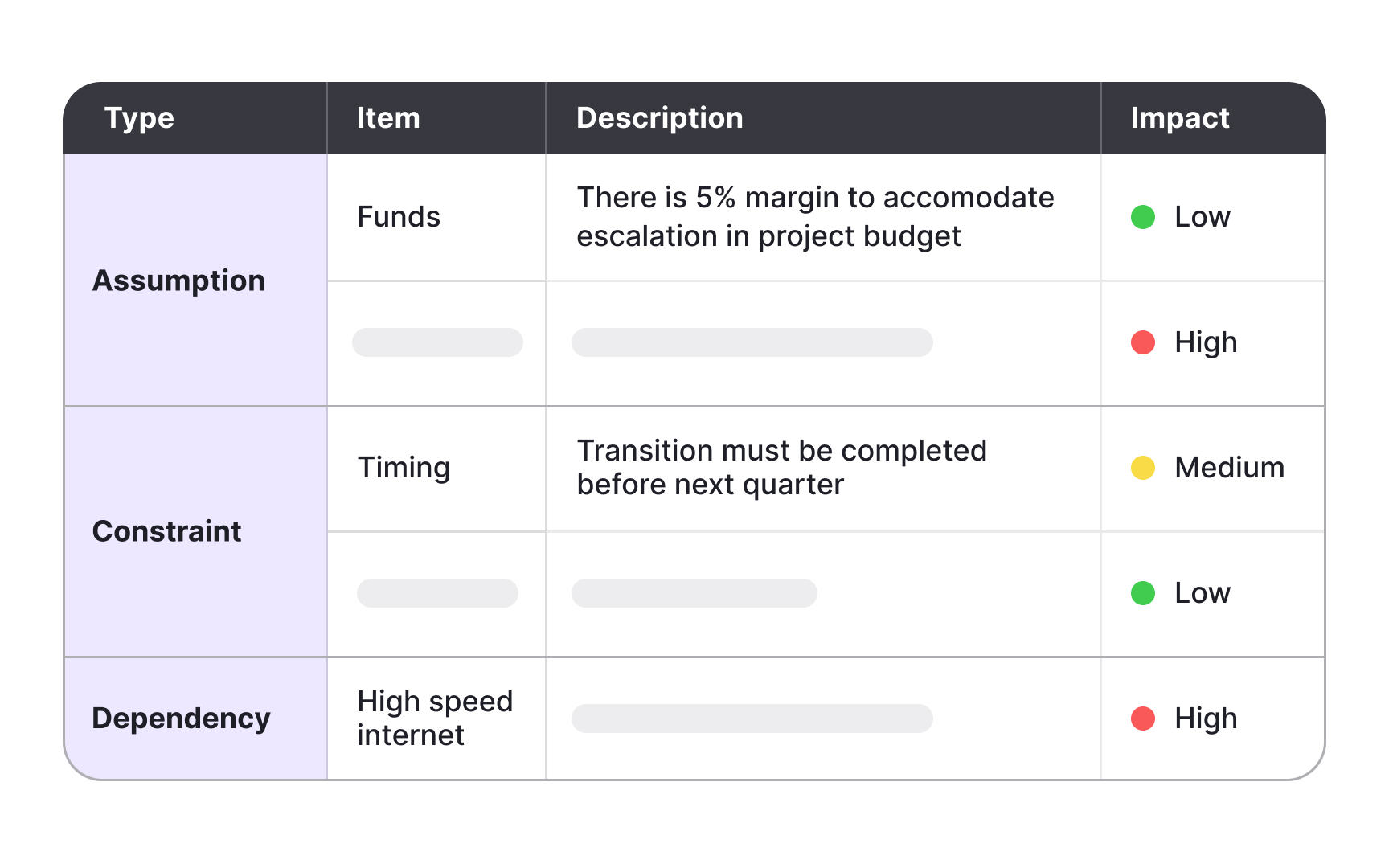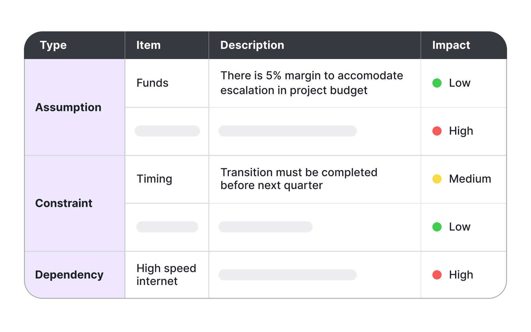 Assumptions represent what the team believes to be true but cannot yet confirm. They often fill gaps during early planning when not all data is available. While assumptions can guide direction, leaving them untested creates hidden risks that may surface later in development.