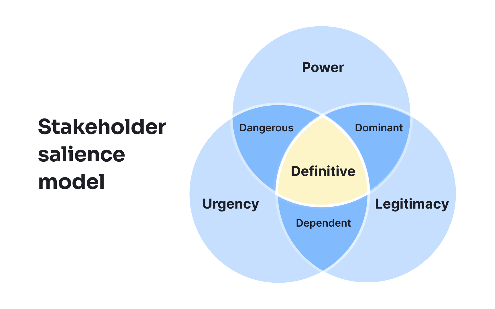 - Salience model: adds legitimacy and urgency to the analysis, showing which stakeholders’ needs deserve priority when time or authority conflicts arise.