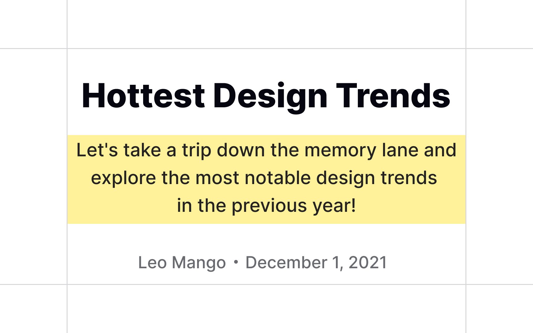 Also, within typographic hierarchy, remember that your eyebrow heading is likely to be read after your article's title and subtitle, when all three are formatted well. Eyebrow headings are generally formatted in a way that does not compete for attention with the title and subtitle formatting, as they contain less important, tertiary information.