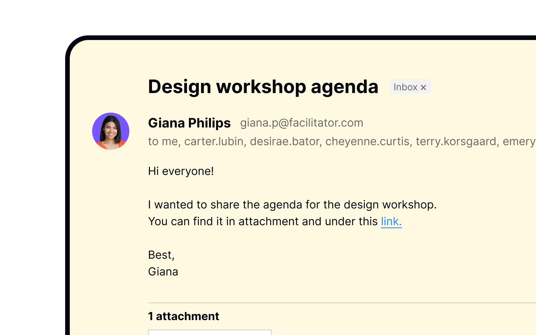Once the planning is done and the team, time, and venue are established, send out invitations. Include the short version of the agenda in the invitation to help participants understand why they are invited and what is expected of them.