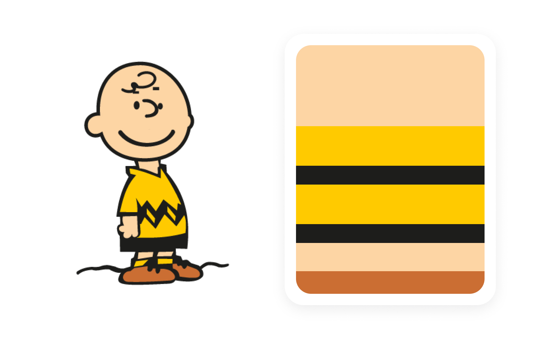 Charlie Brown is probably best known for his single lock of hair and bumblebee wardrobe of yellow and black. However, over the years, his shirt has been red, orange, green, blue, and yellow, with red and yellow used most often.[1] The color palette also depends on the kind of media Charlie appears in — whether it's a comic, a TV show, or a figurine.