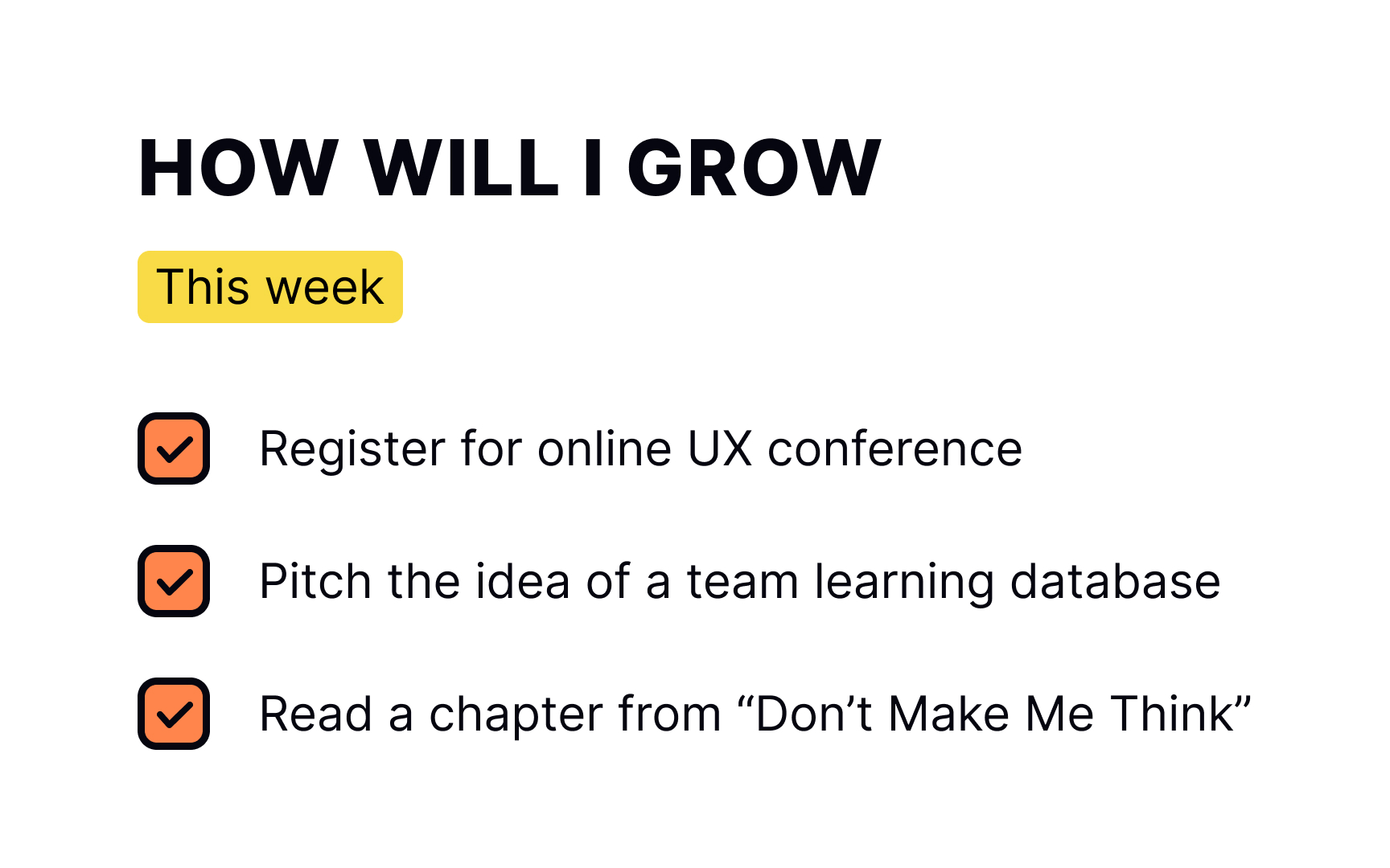 - Training or workshops: Conduct training sessions or workshops on a UX topic you're good at. This can improve your public speaking and leadership skills.