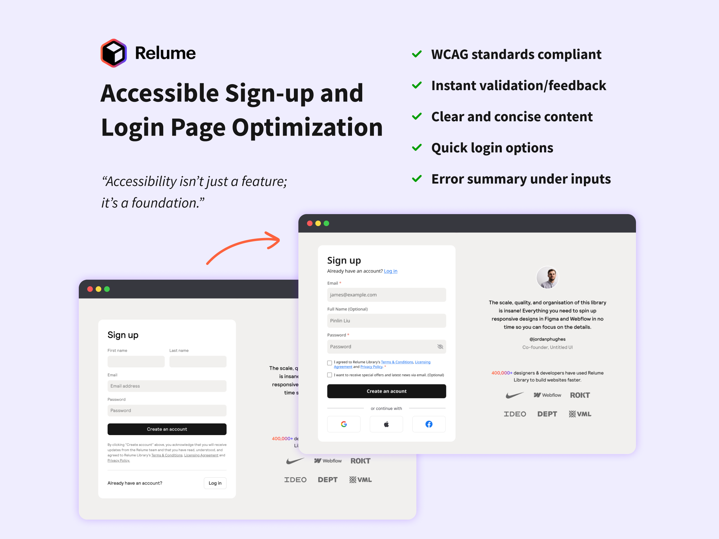 Your redesign for Relume’s signup & login flow clearly shows strong UX thinking and accessibility awareness 💡