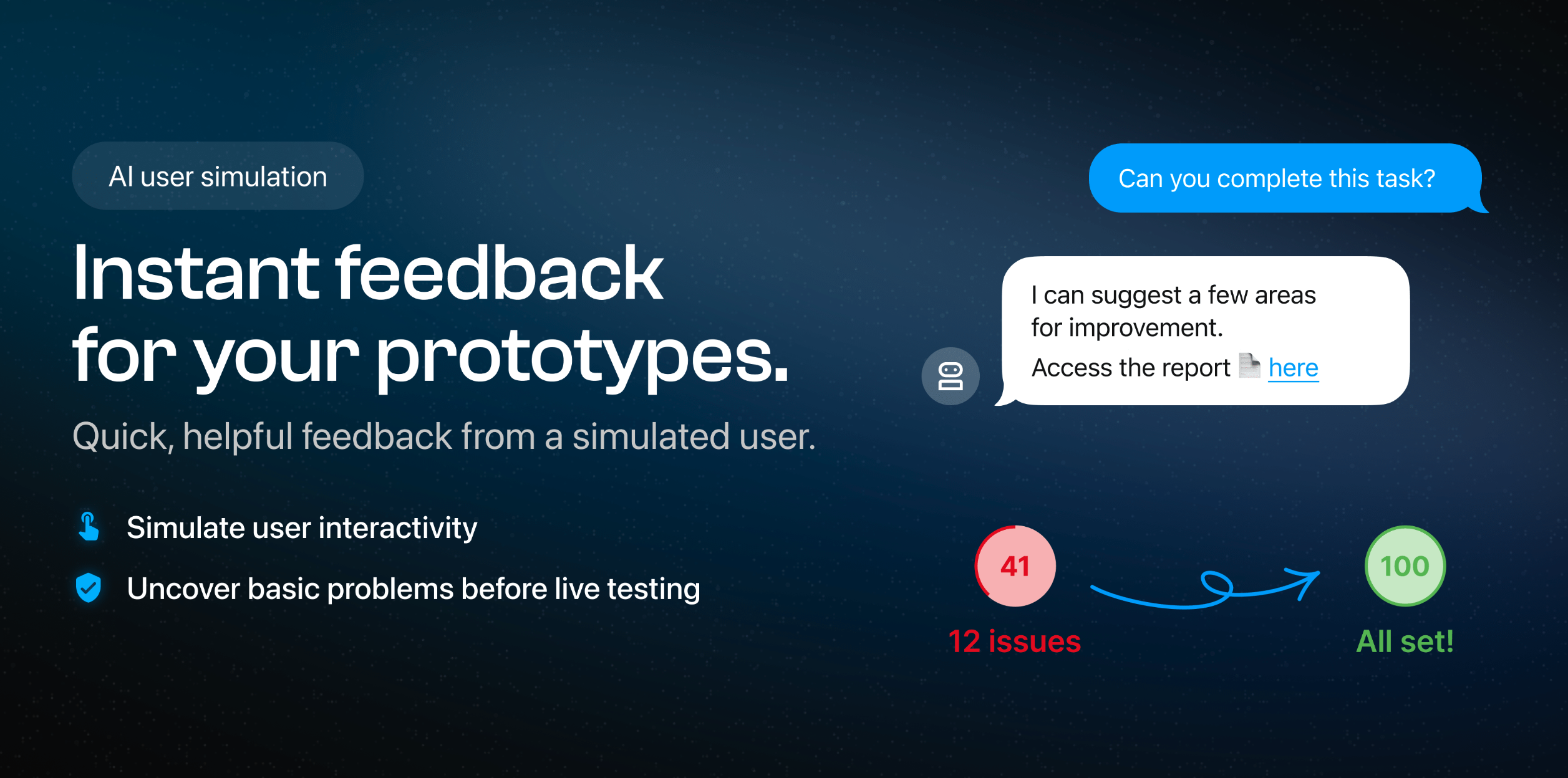 Our Figma plugin tests interactive prototypes with AI to ensure you avoid embarrassing failures and wasting human time. Always test first with simulations!