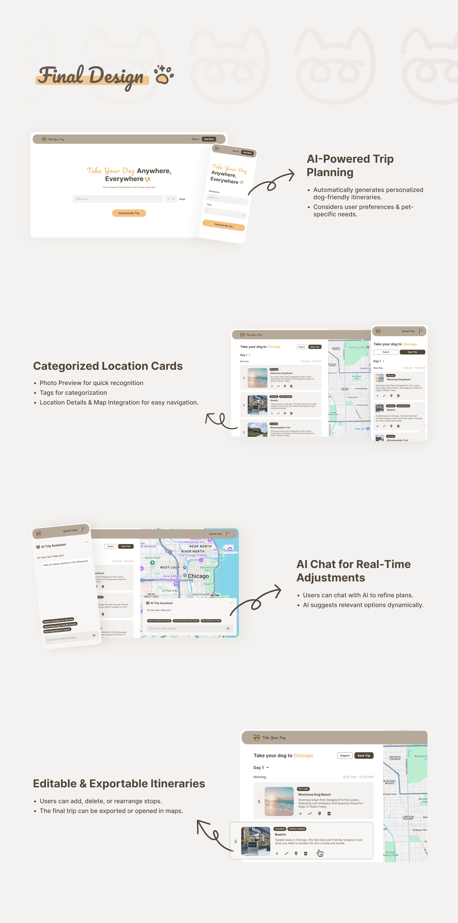 Hi Yuting! I really like the logo and the AI-generated routes—very creative! I'd be interested in seeing any user interviews or usability testing you've done with the tool. As someone who isn't a dog owner, it's a bit hard for me to grasp the product's value. One suggestion: consider checking the contrast levels on the yellow colour used, as it may pose accessibility challenges for some users.