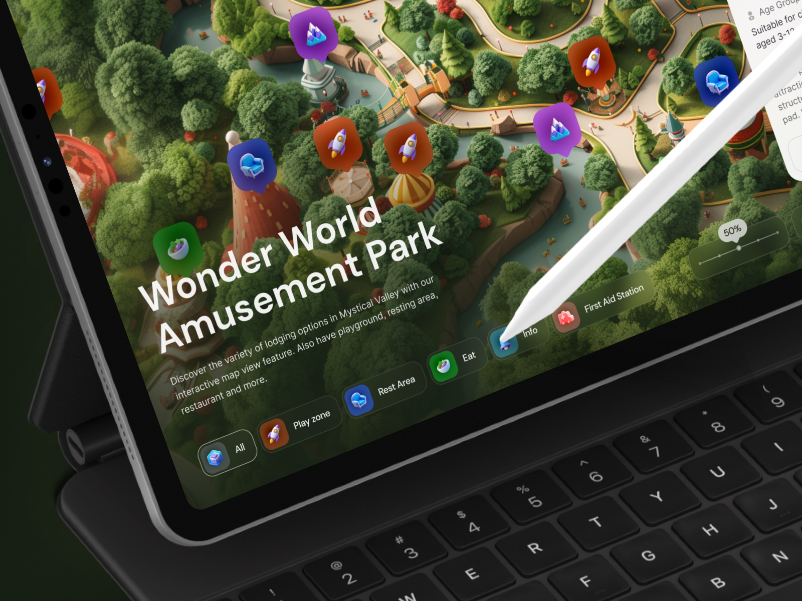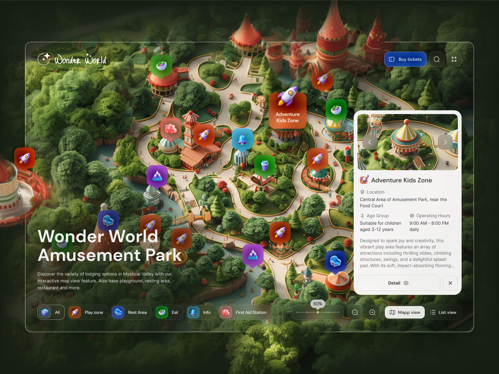 The Wonder World Amusement Park UI design offers a vibrant and interactive way to explore the park’s attractions and facilities. This design ensures a delightful user experience with easy navigation and detailed information.