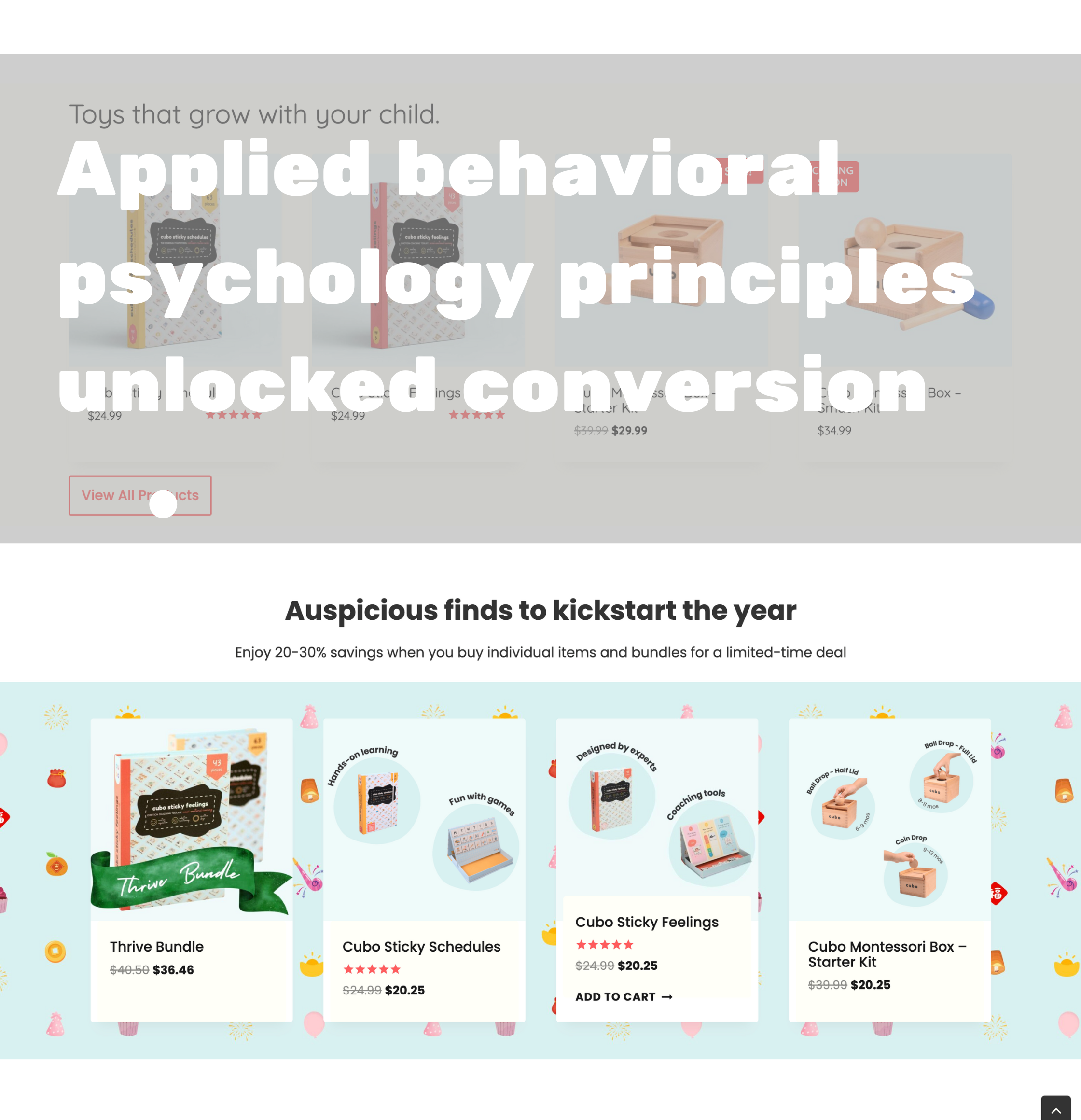 Low conversion rates in a minimalist-design educational toys store. Individual product cards lacked differentiation, pricing appeared arbitrary without context, and the neutral color palette failed to establish visual hierarchy. Parents faced decision paralysis when choosing between similar product options.