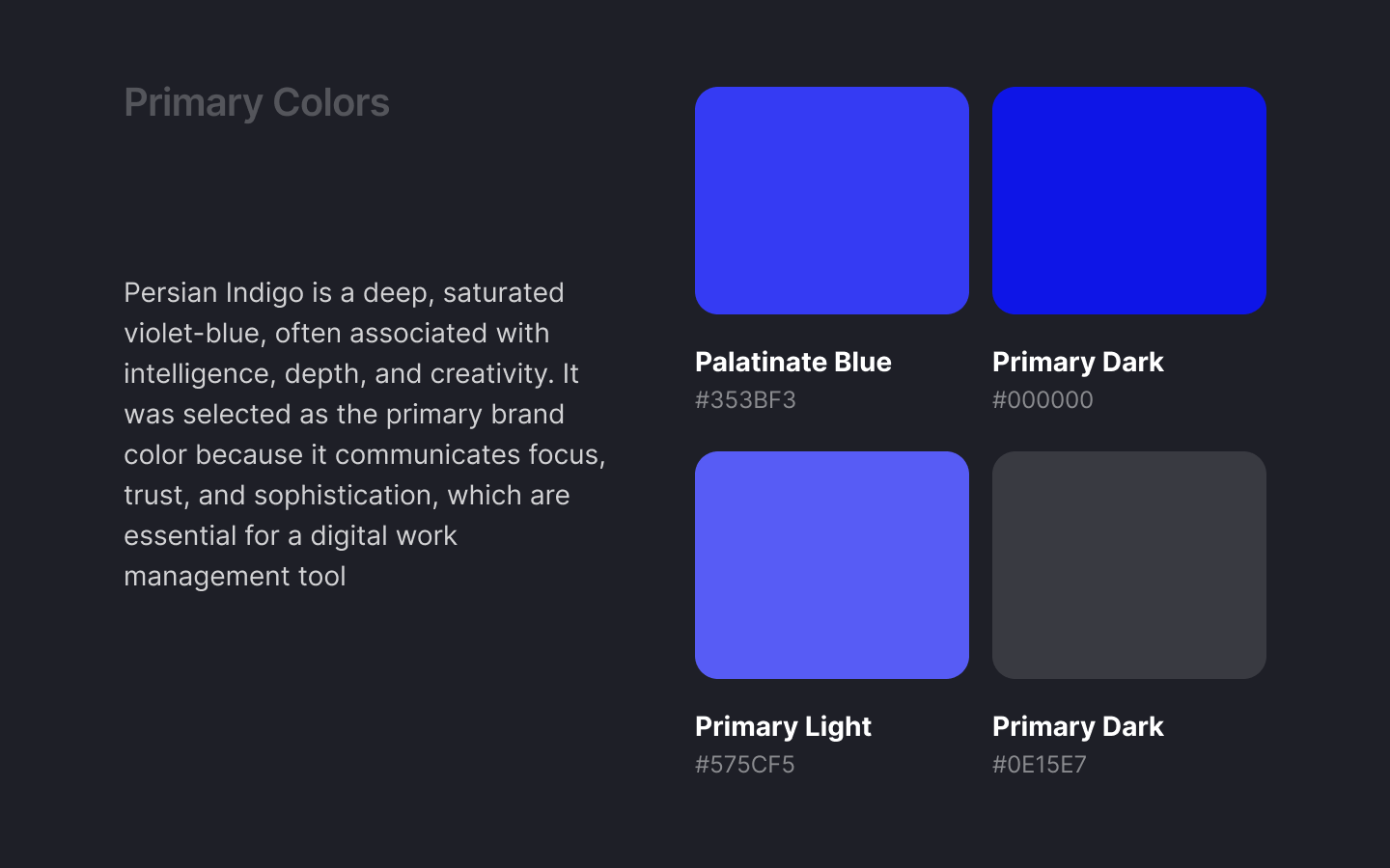 - You label the primary colour as Palatinate Blue with HEX #353BF3, but this value doesn't match the traditional definition of Palatinate Blue (commonly around #273BE2).