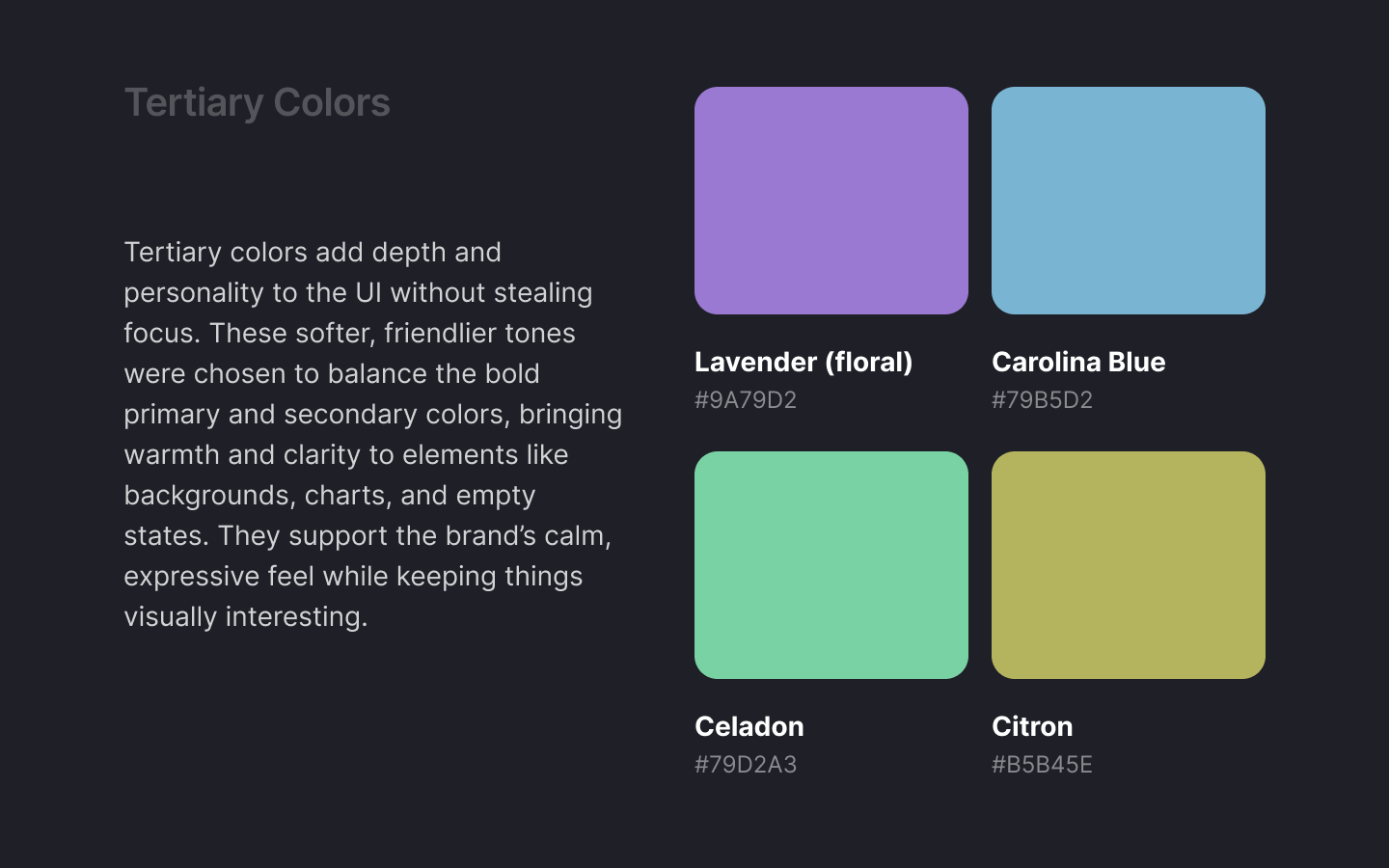 The tertiary colors give more flexibility. I use them when I need to add emotion, variety, or soft accents. They help break the monotony and keep the interface feeling more human.