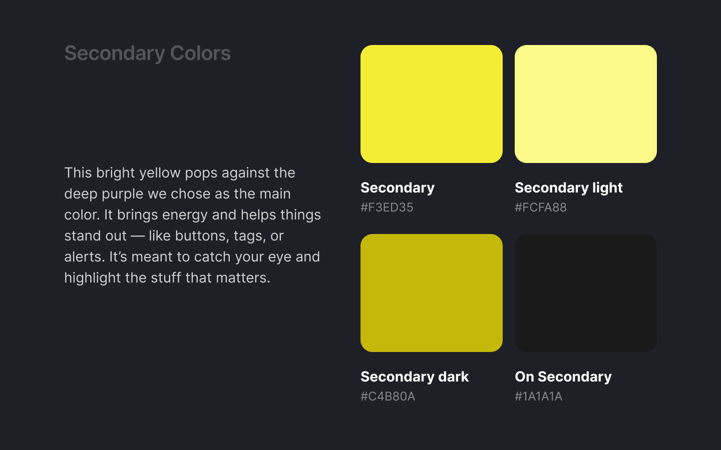 The secondary colors are there to help things stand out — like buttons, tags, or highlights — without clashing with the main colors. They bring energy and contrast.