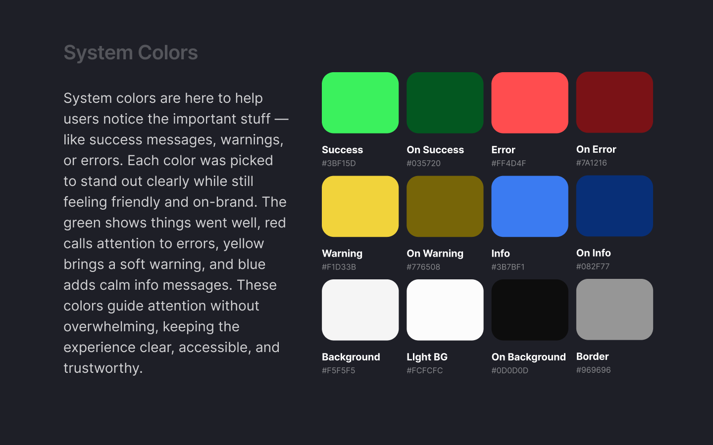 The system colors are all about communication. Success, error, warning, and info use clear, readable colors so feedback is instantly recognizable. I also picked background, light background, and on background color (mostly used for text) and border colors carefully — they set the foundation for the whole interface. They’re neutral but considered, making sure everything feels stable, readable, and easy on the eyes.