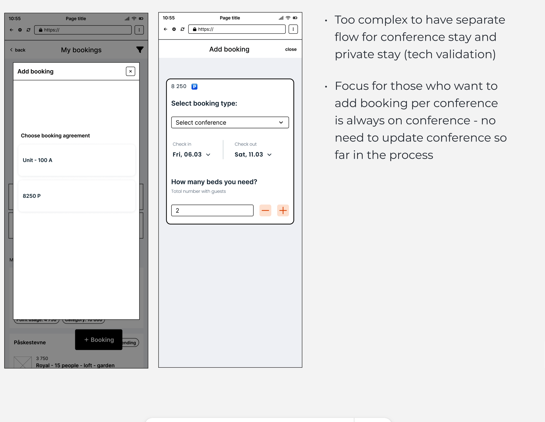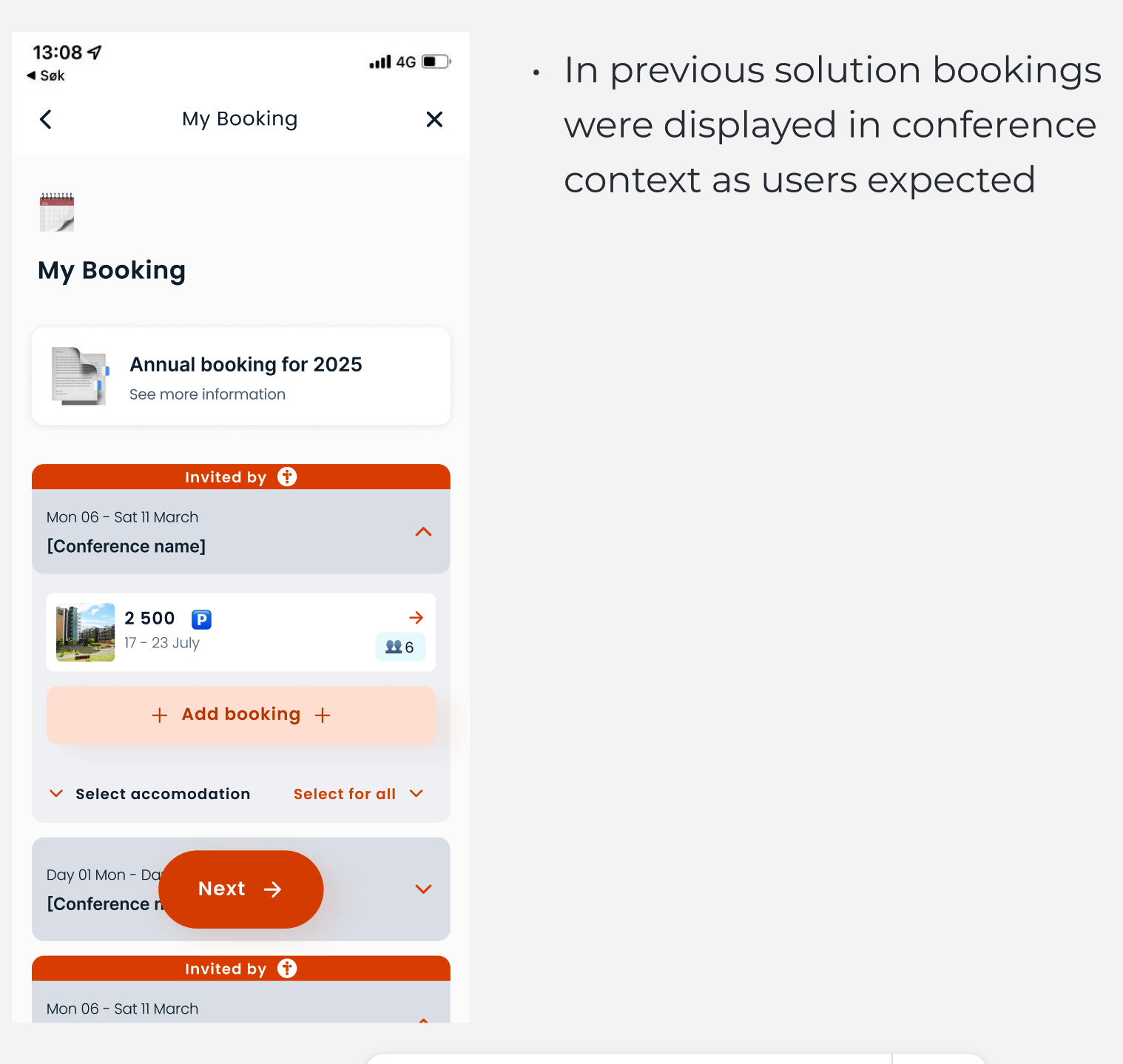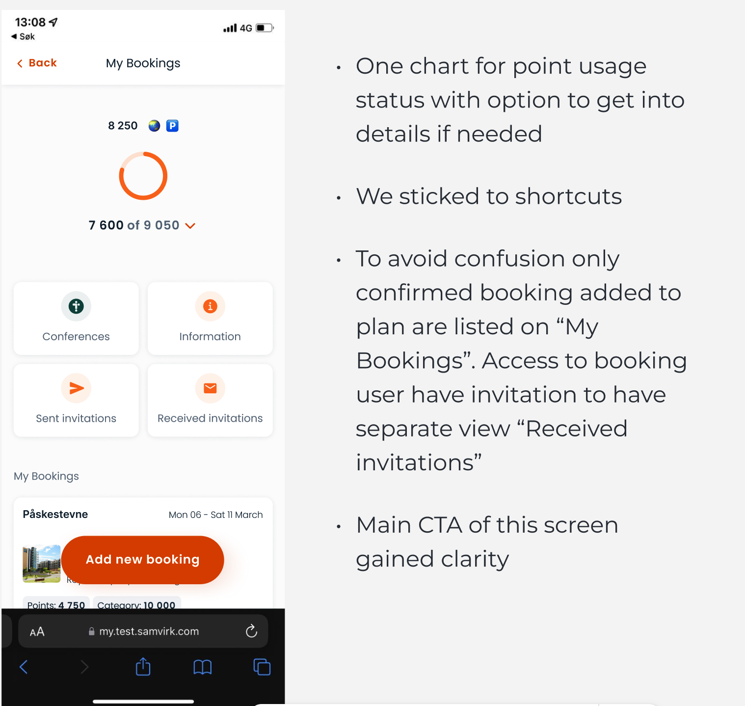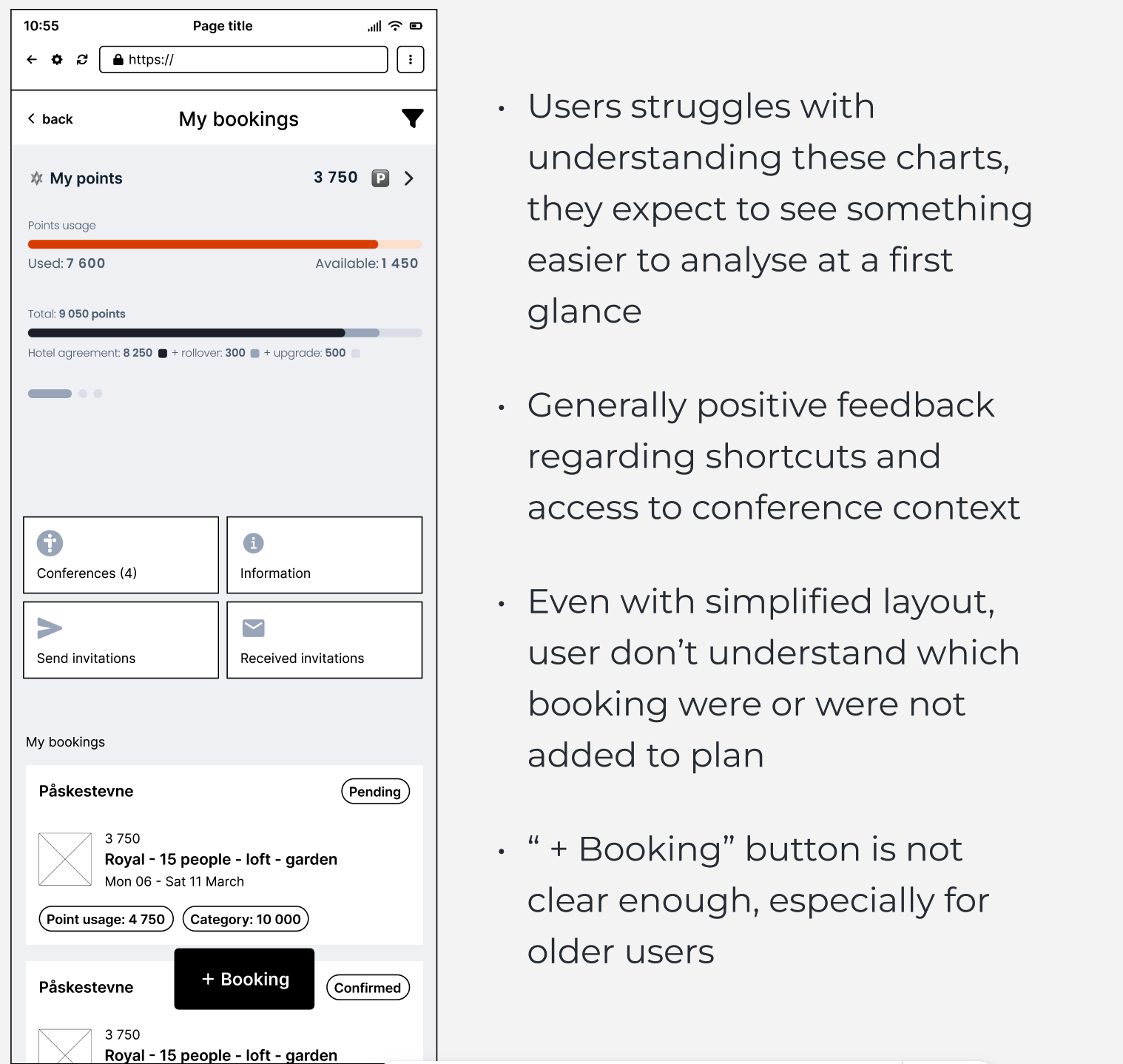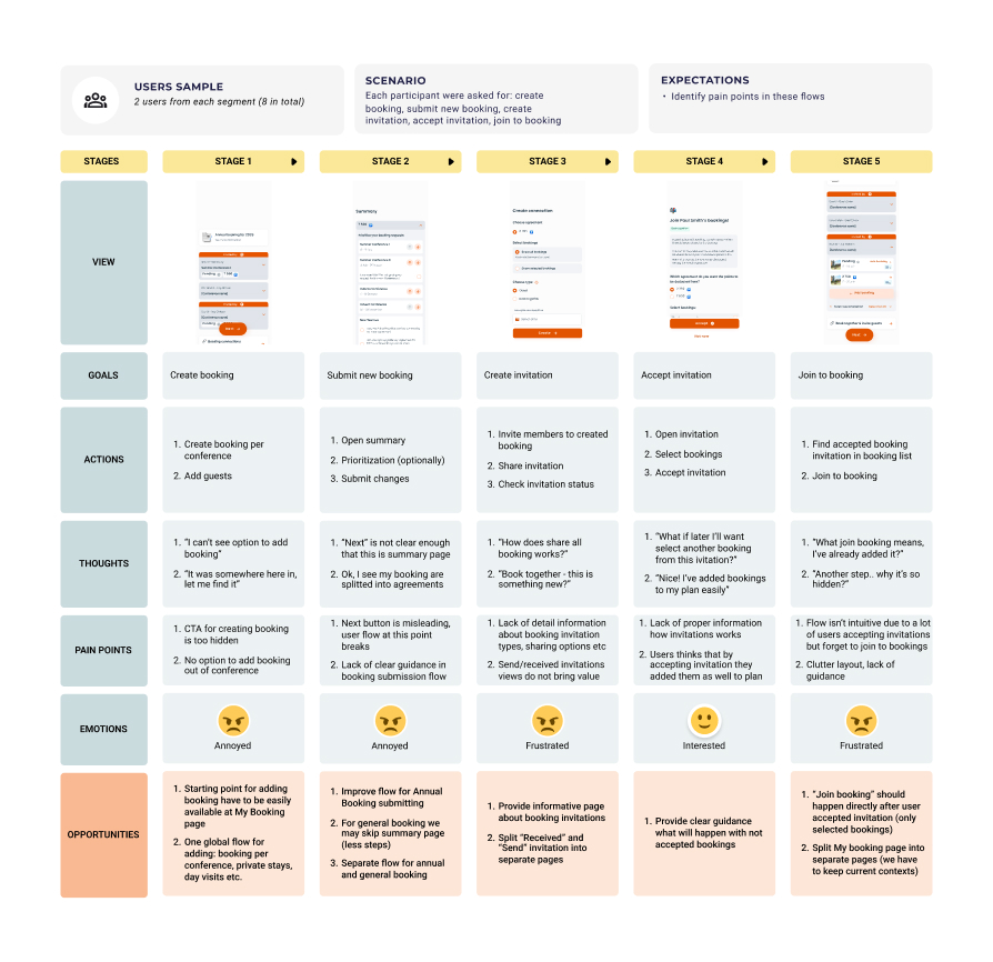- We defined pain points: User research help us to understand what we should focus on: declutter “My Booking” page, provide general flow for adding all types of booking, split “received” and “send” invitations pages, redesign accpeting invitation flow