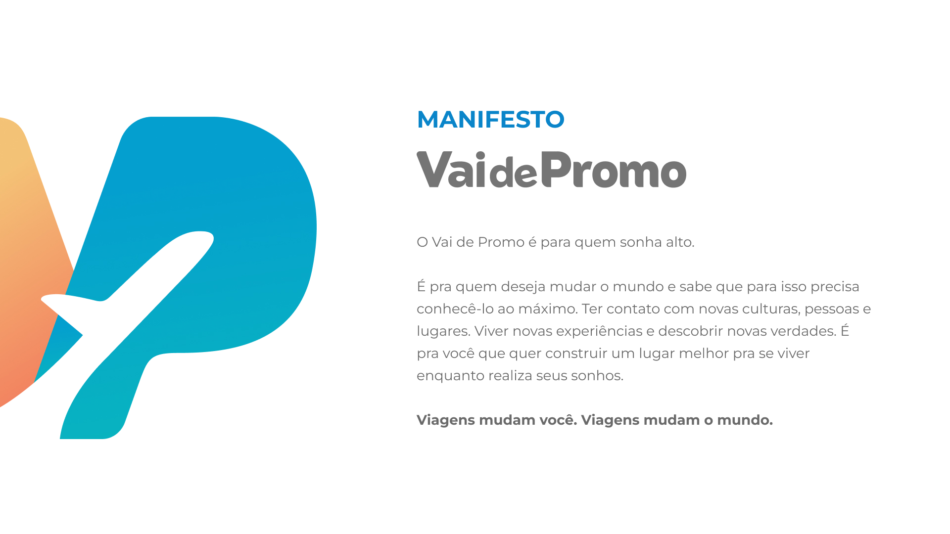 It is this exposure to new realities will improve the individual as a human being. "Improved", they return home with more awareness and ready to improve the reality around them. Following this logic, with every trip Vai de Promo sells, more people would feel inspired to bring beneficial changes to the world. From this logic, the great motto of the new brand emerges: