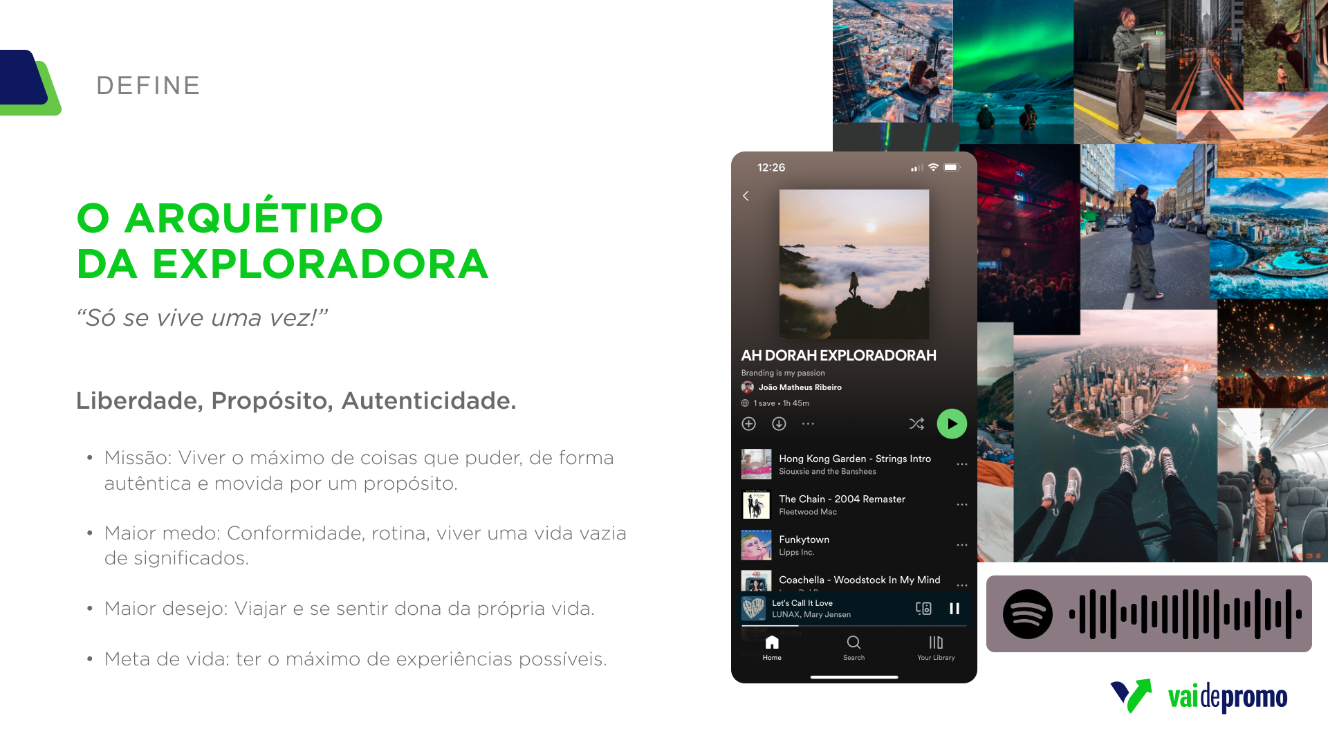 Based on these findings and the proto-persona, we selected the Explorer as the archetype to be followed for the brand. We created a moodboard to inspire the visuals and also a playlist on Spotify to inspire the team and bring the vibe. It became clear that the type of trip that would raise the interest from users would have to be focused on freedom. Photos with a visible horizon, places to explore in groups, and discoveries that would become good stories to be told would be the most desired items for them.