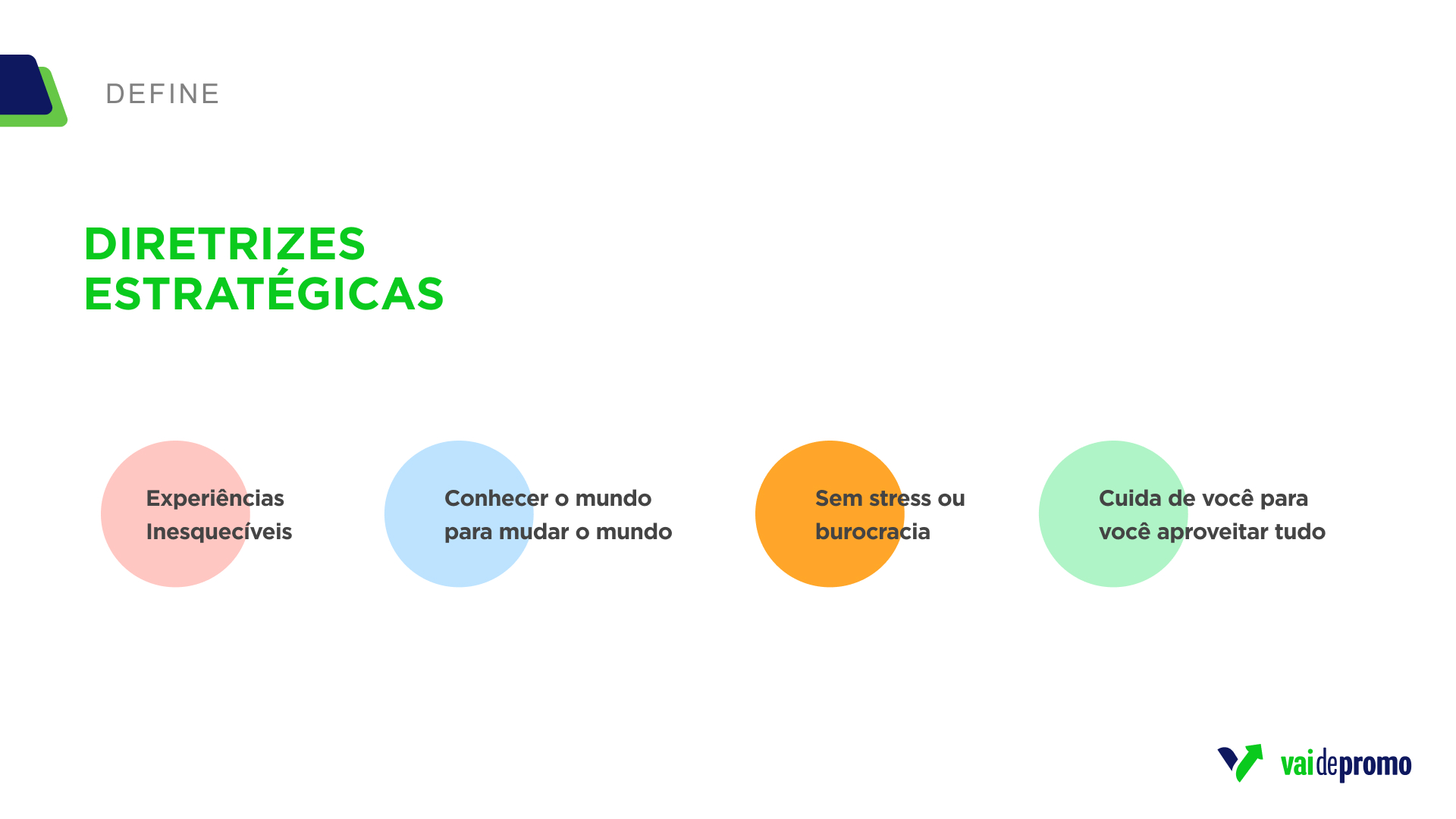 To achieve its goals, “Vai de Promo” needed to be a lighter brand, both in its visions and communicatioon. Making dreams come true should be the brand's ultimate goal, as that is how it would sell trips. It needed to stand out from competitors, but without losing visual characteristics that indicate it is a tourism brand. It should embody and defend strong defining values and maintain excellence in serving its audience. But above all, it needed a purpose.