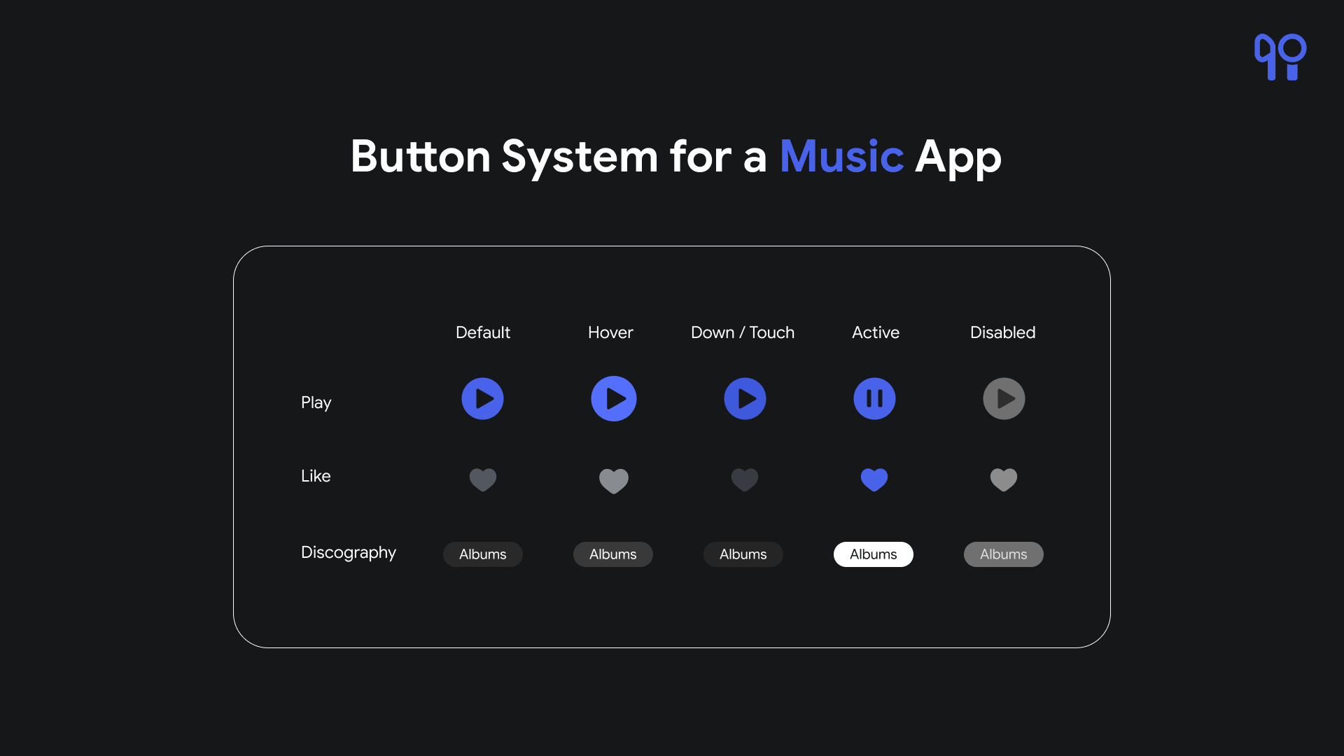This design ensures consistency and clarity in button interactions within your music app, enhancing user experience and engagement.