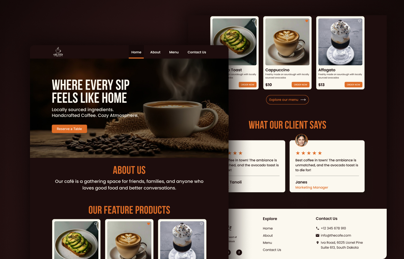 A single-page landing site for The Café designed to communicate a warm, handcrafted brand and drive two main actions: Reserve a table and Order featured items. Completed with ChatGPT’s assistance.