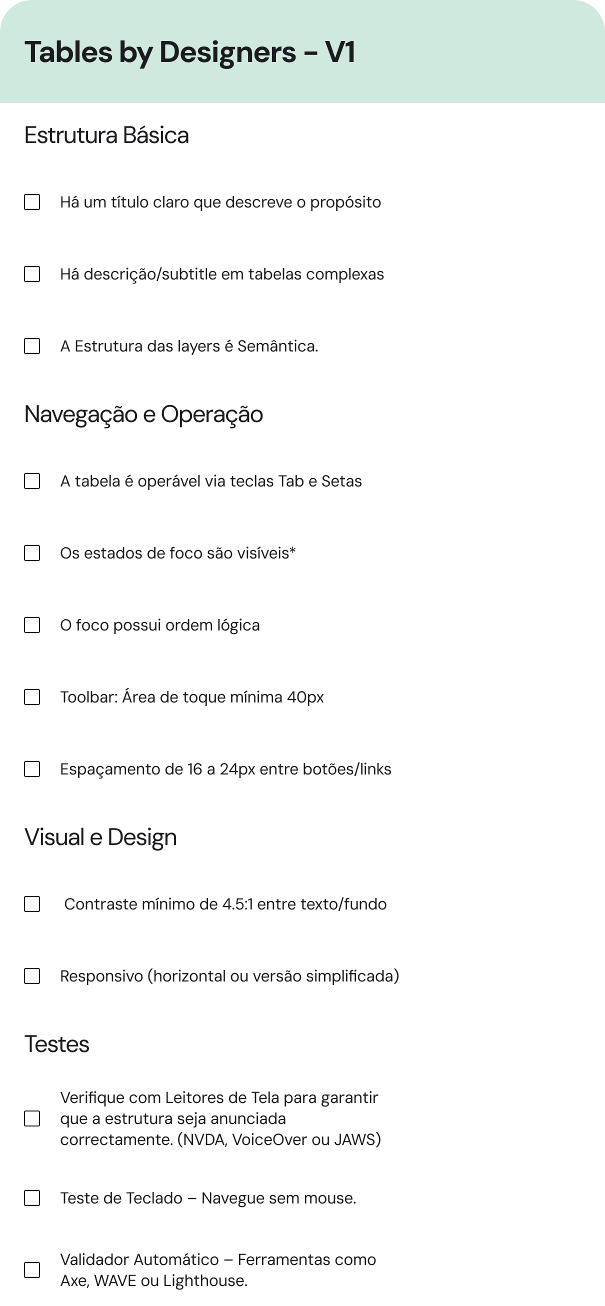 Requisitos básicos para criar uma tabela minimamente acessível. Para aplicar estes requisitos com sucesso, é necessário que todos os responsáveis pelo projeto estejam alinhados (Designers, PMs, QAs, Devs).