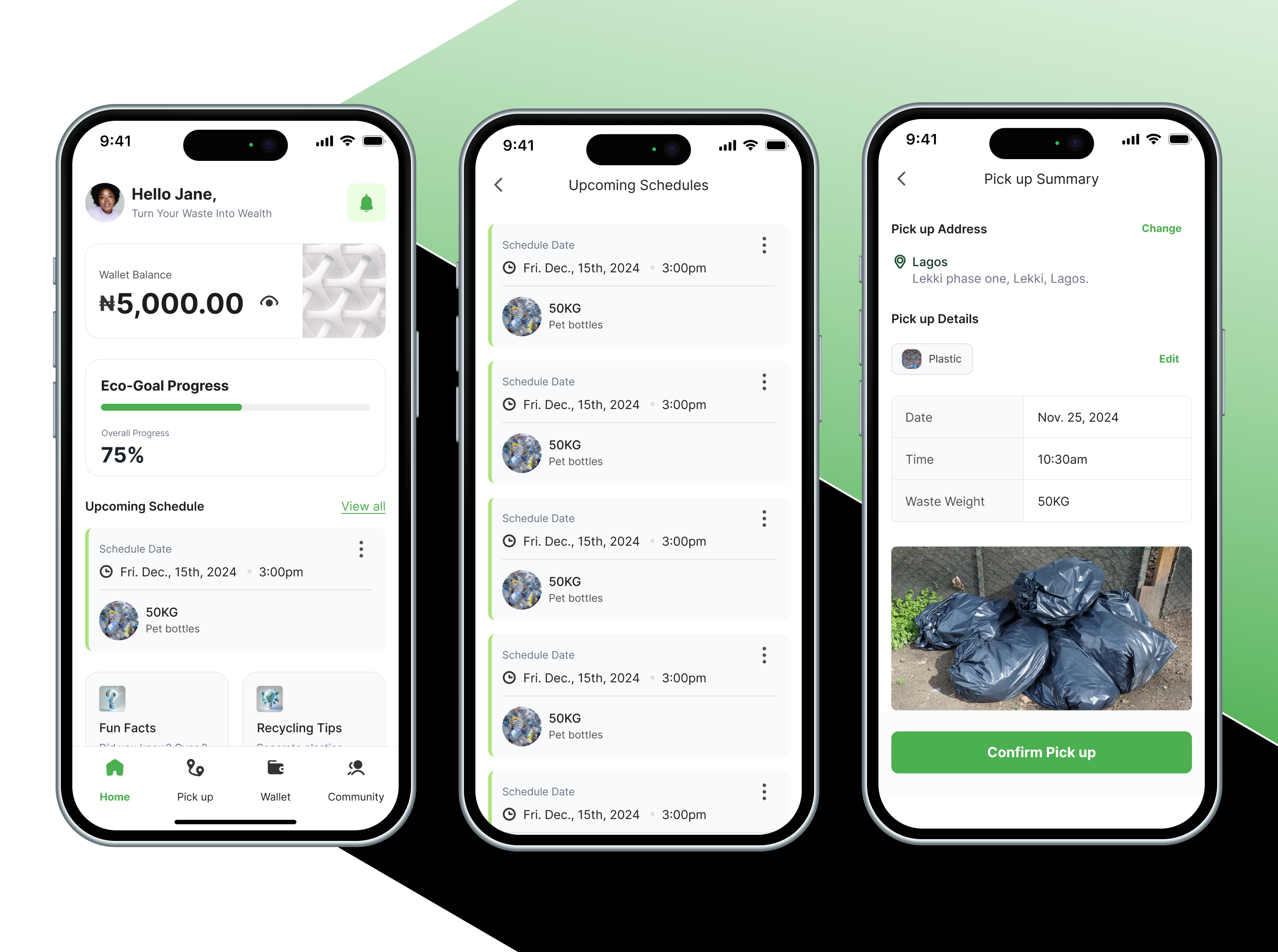 On the pick-up summary, the success message works, but it’s flat. Add something meaningful like "You just saved 2kg of CO₂" right after confirmation. And the trash image looks raw — give it a border radius to match the UI.