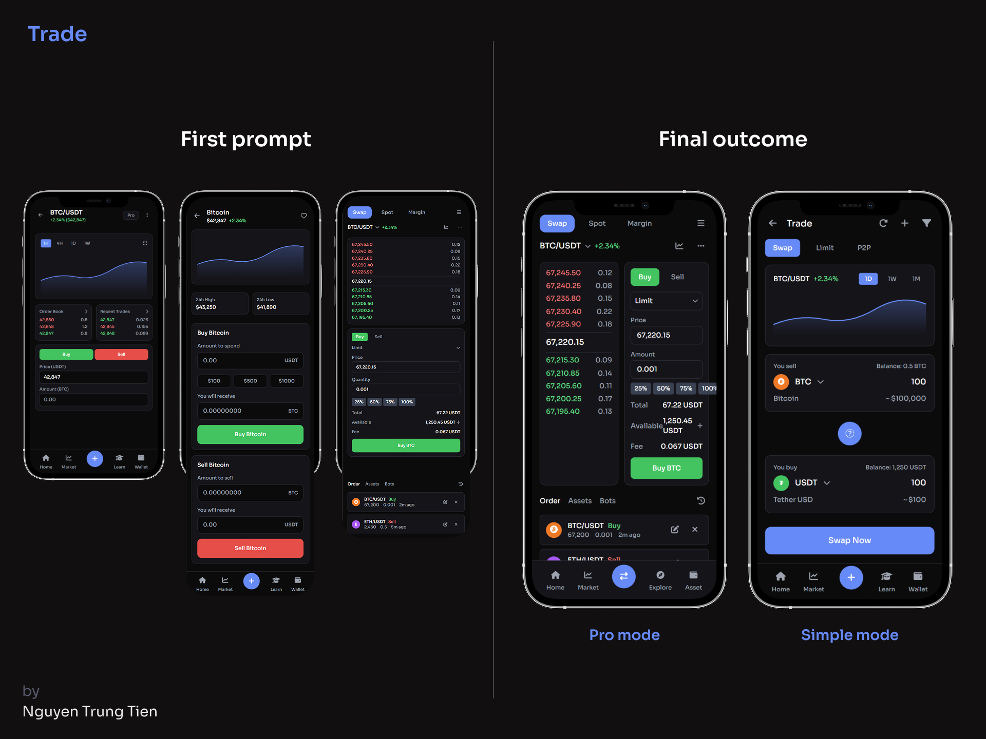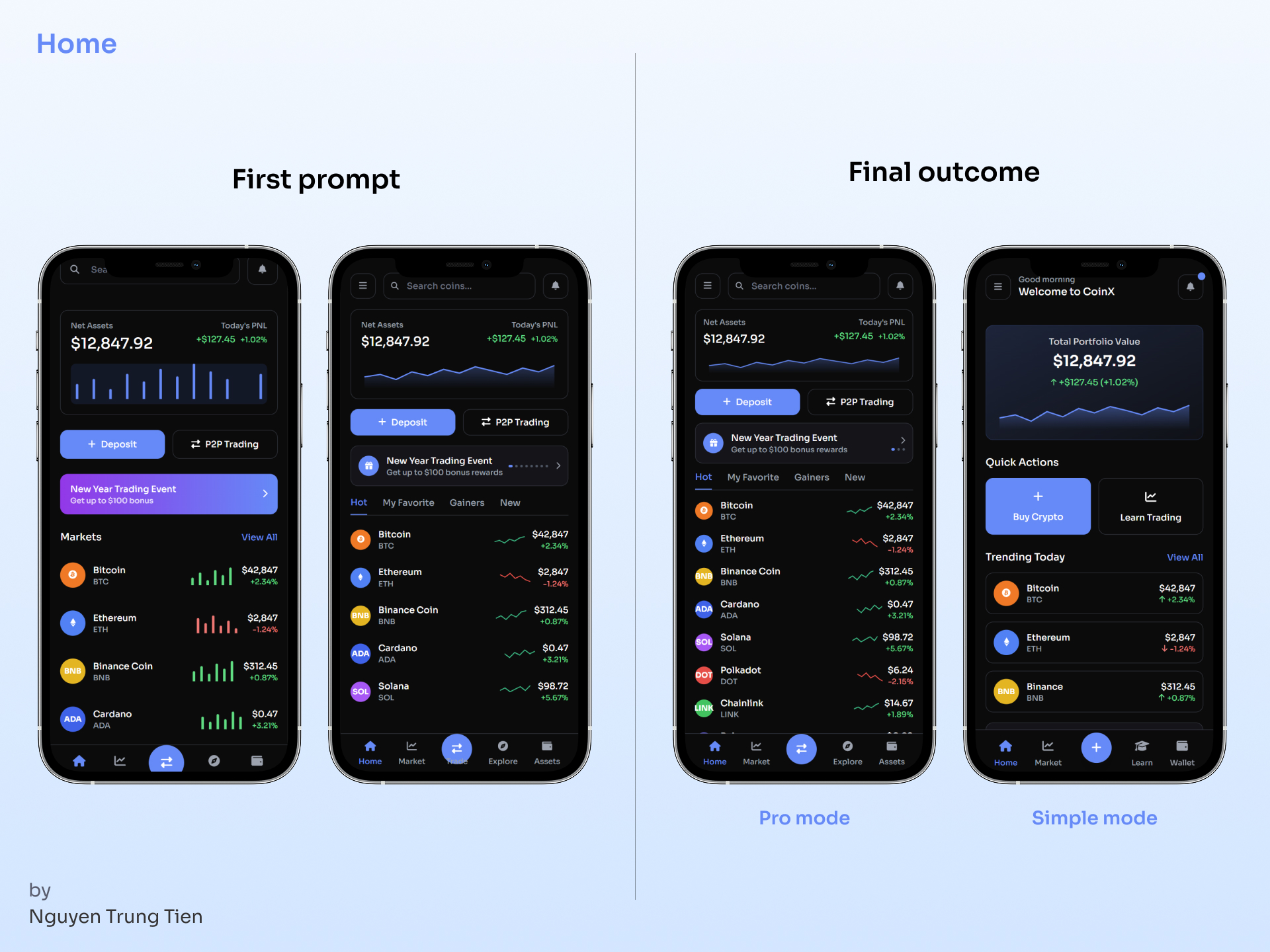 Home screen, I came up with two display modes Pro Mode for experienced traders and Simple Mode for beginners. I started with a fairly general prompt, which led to a few issues in the output: it generated a bar chart instead of a line chart, the event banner looked unattractive, and the “Trade” text in the navigation bar overlapped with the icon.