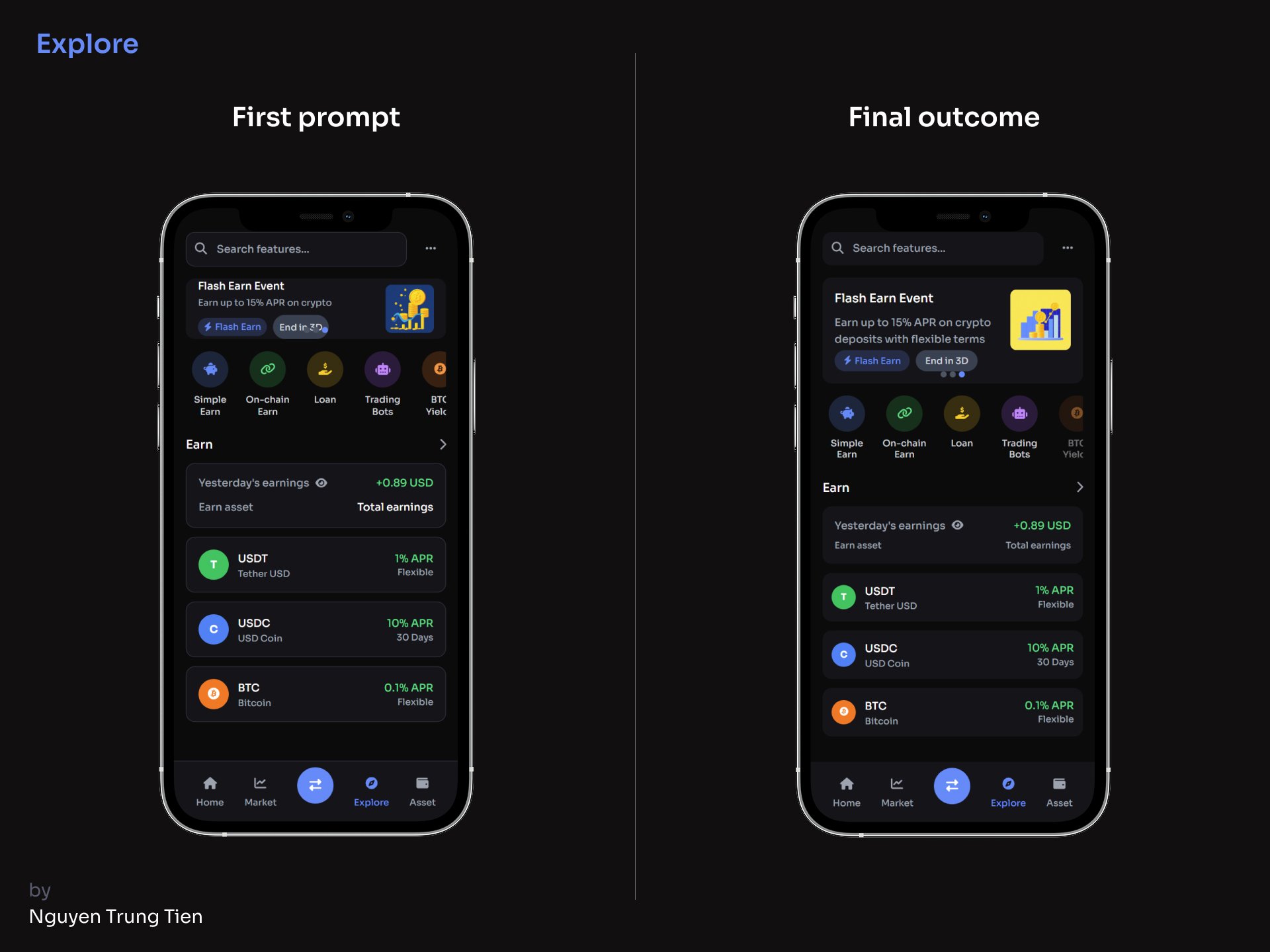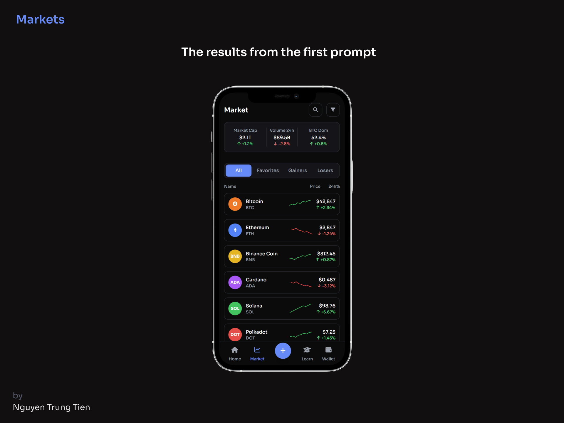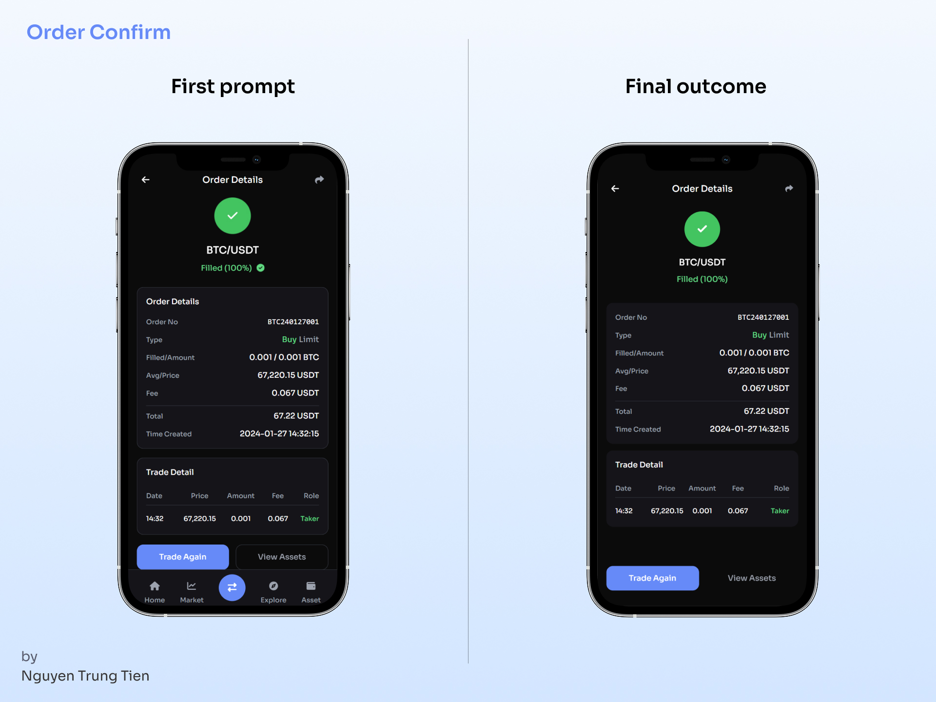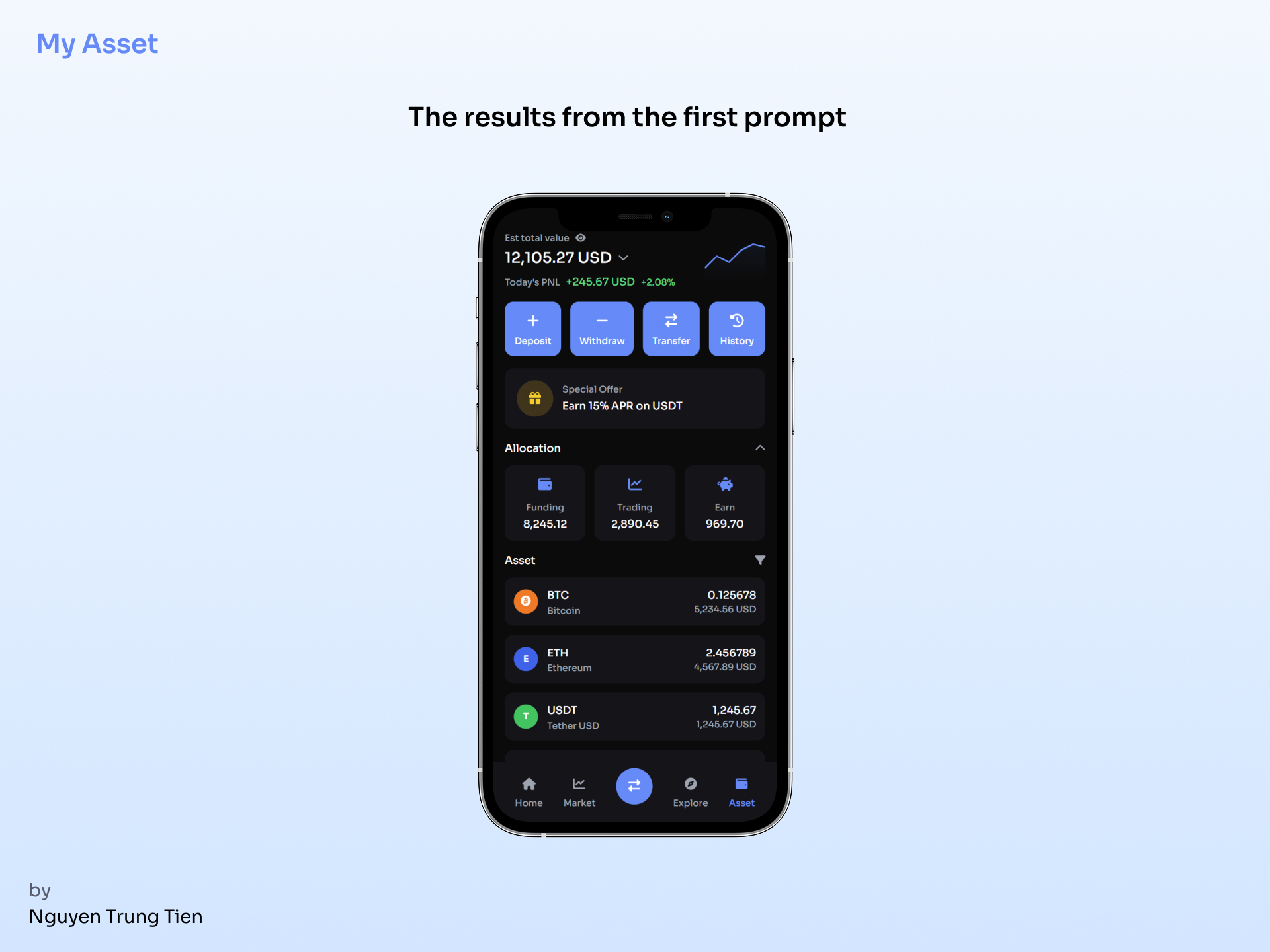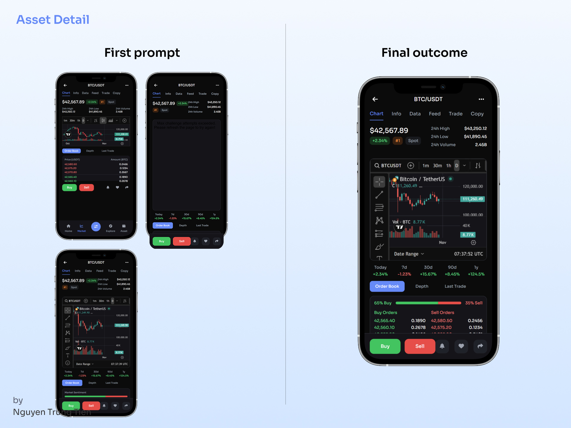 Asset detail screen, I had to write a fairly detailed prompt to achieve the layout I wanted. What surprised me was that the AI was able to embed a TradingView chart directly into the design and make it run in real time something I really liked.