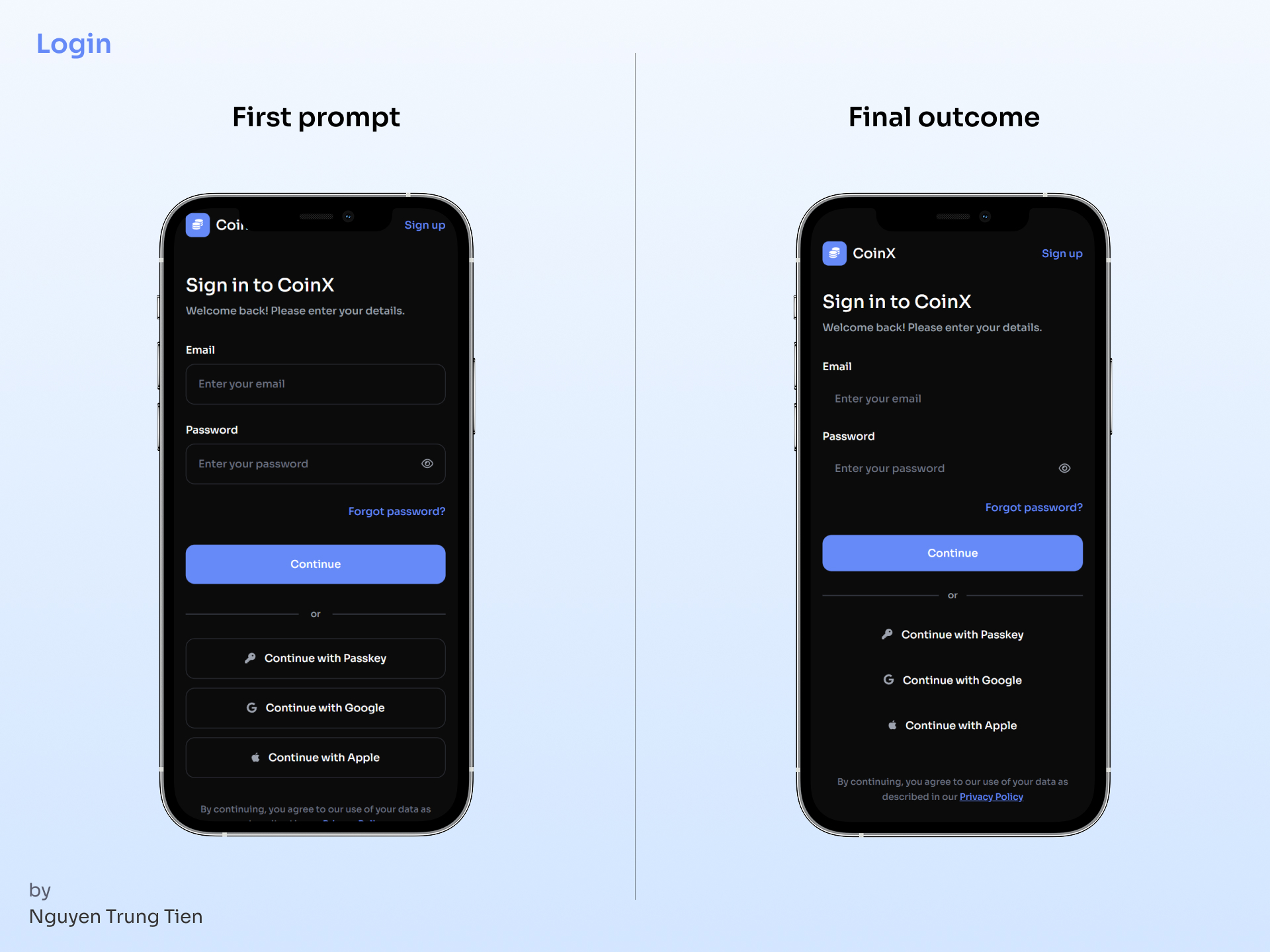 The first attempt at the login screen produced a satisfying result, but it still had issues with the safe area, and the UI extended beyond one screen, requiring scrolling. In the next prompt, I clearly described these issues — and they were successfully fixed.