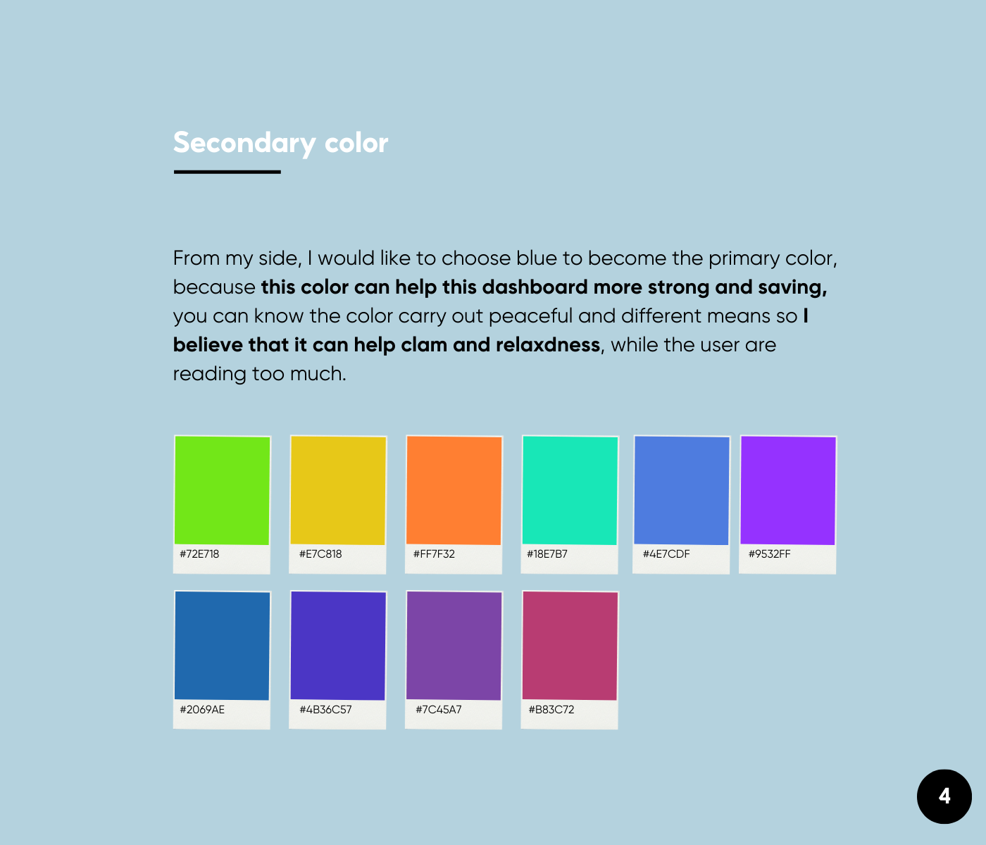 - If the goal is to creating the feeling of calm and relaxing, I do prefer the old version. In general, the use of colors is very consistent as neutral colors are mainly used for text & background, secondary colors are used for charts/ graphic elements and primary colors are used in moderation. In the new version, the use of primary color for all the side menu makes it a bit overwhelmed, as it is hard to know which menu/element is in focus for need more attention.
