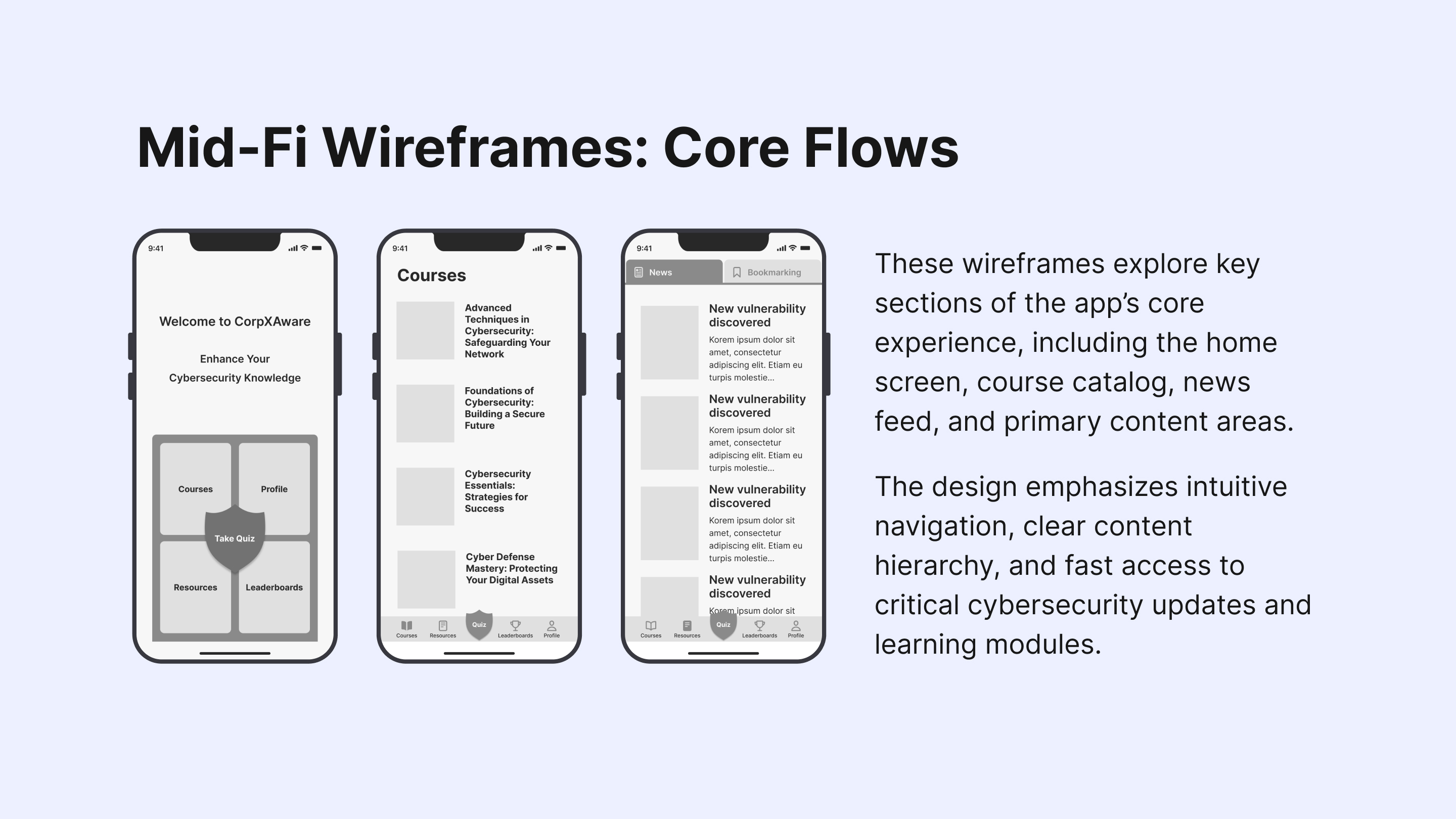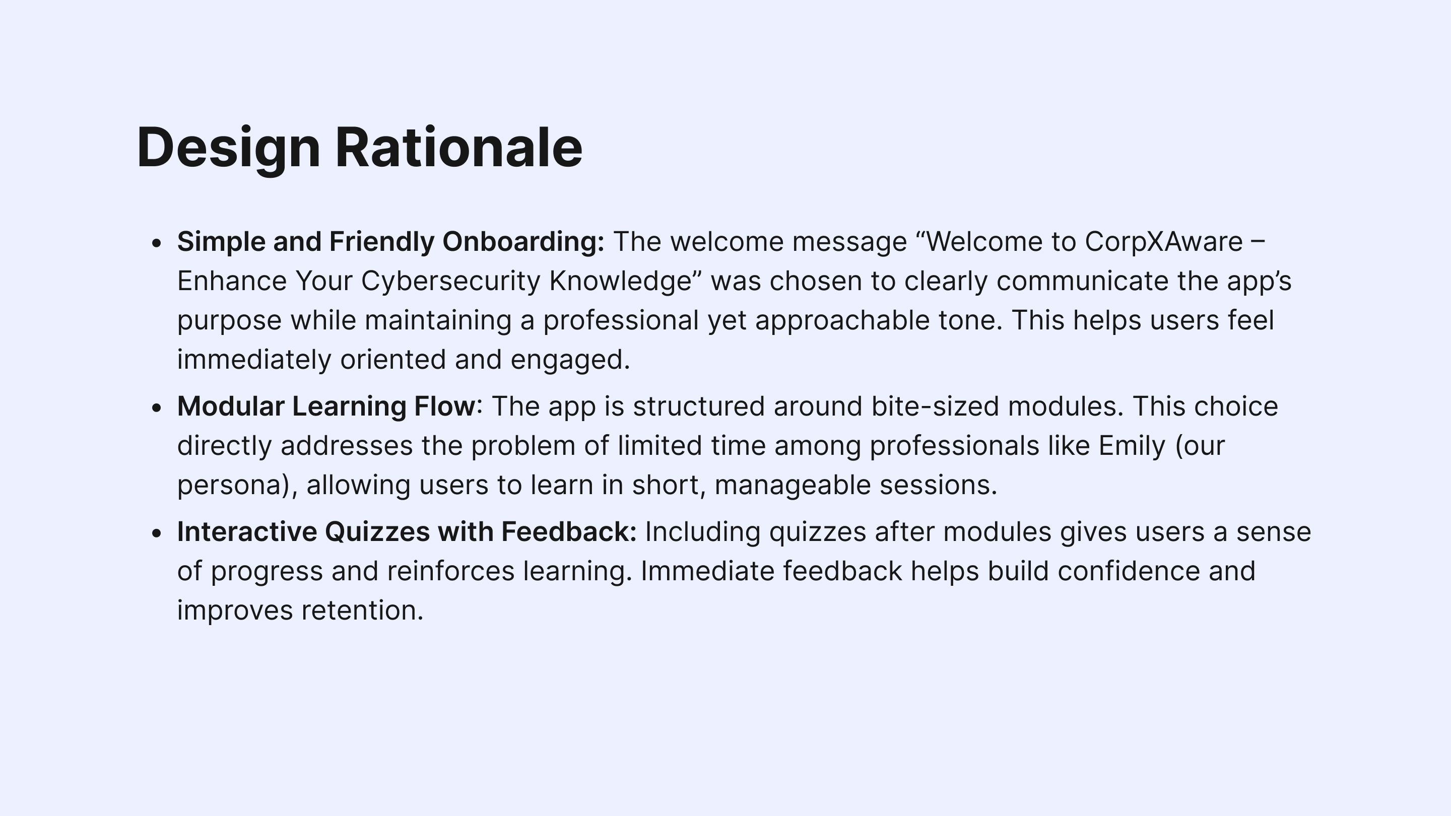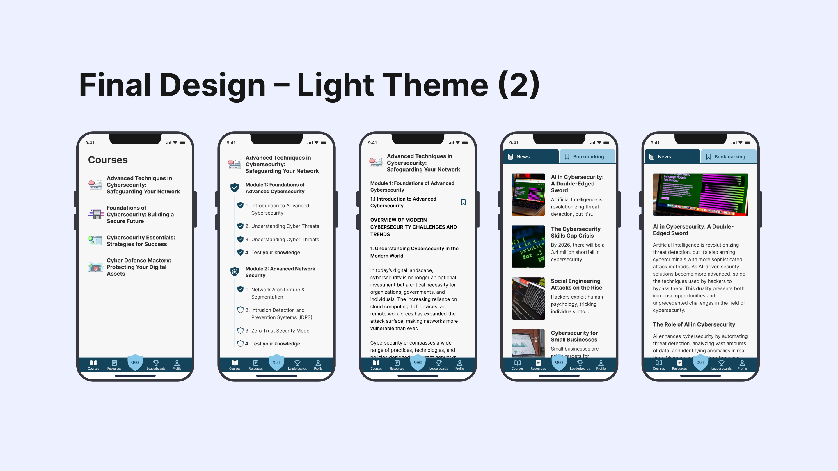 Good job, Iryina, from UI perspective, while the overall look is clean, some screens could benefit from a bit more contrast or visual emphasis on the most important actions. For example, primary CTAs and progress indicators could stand out more to guide users quickly, especially on busy or content-heavy screens. I'd also check course headings and its contrast.