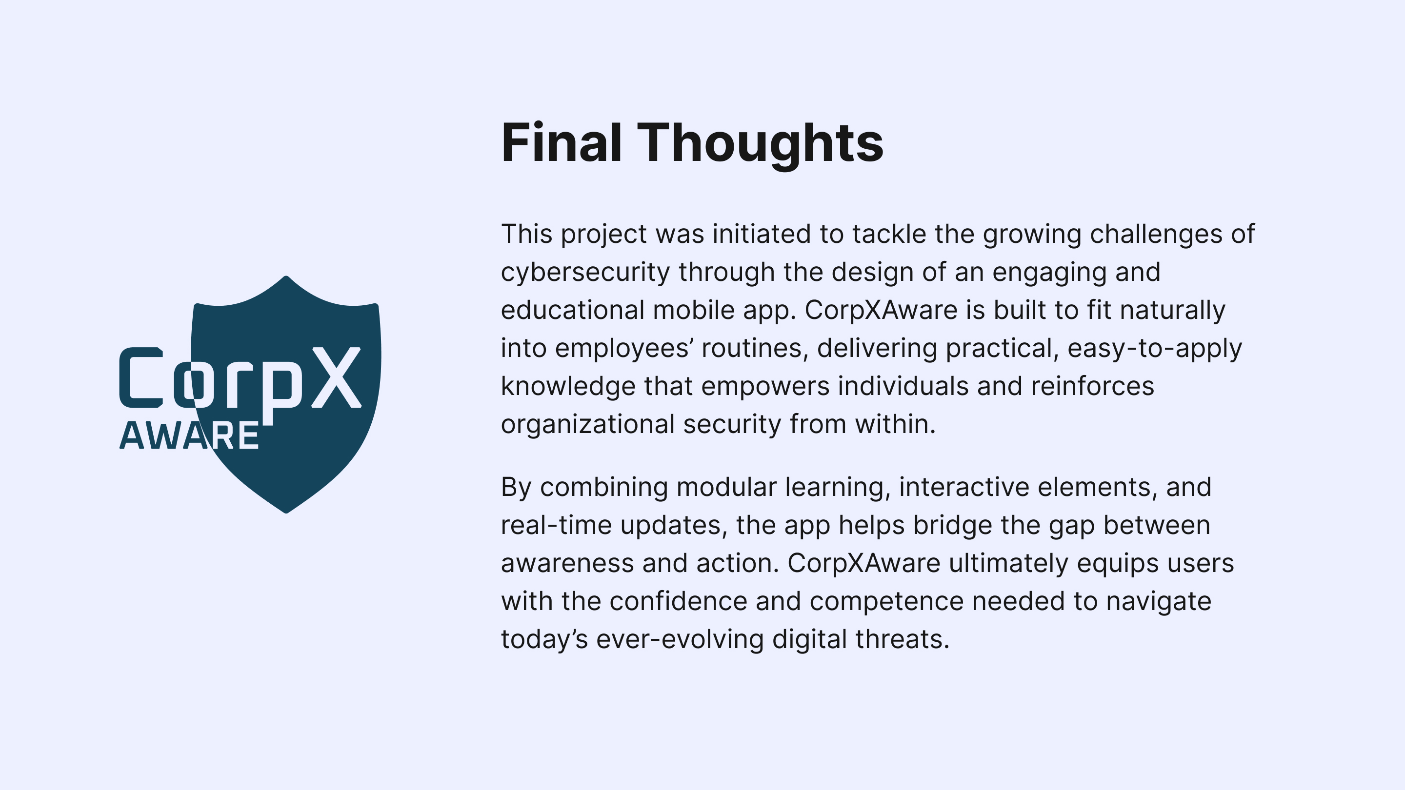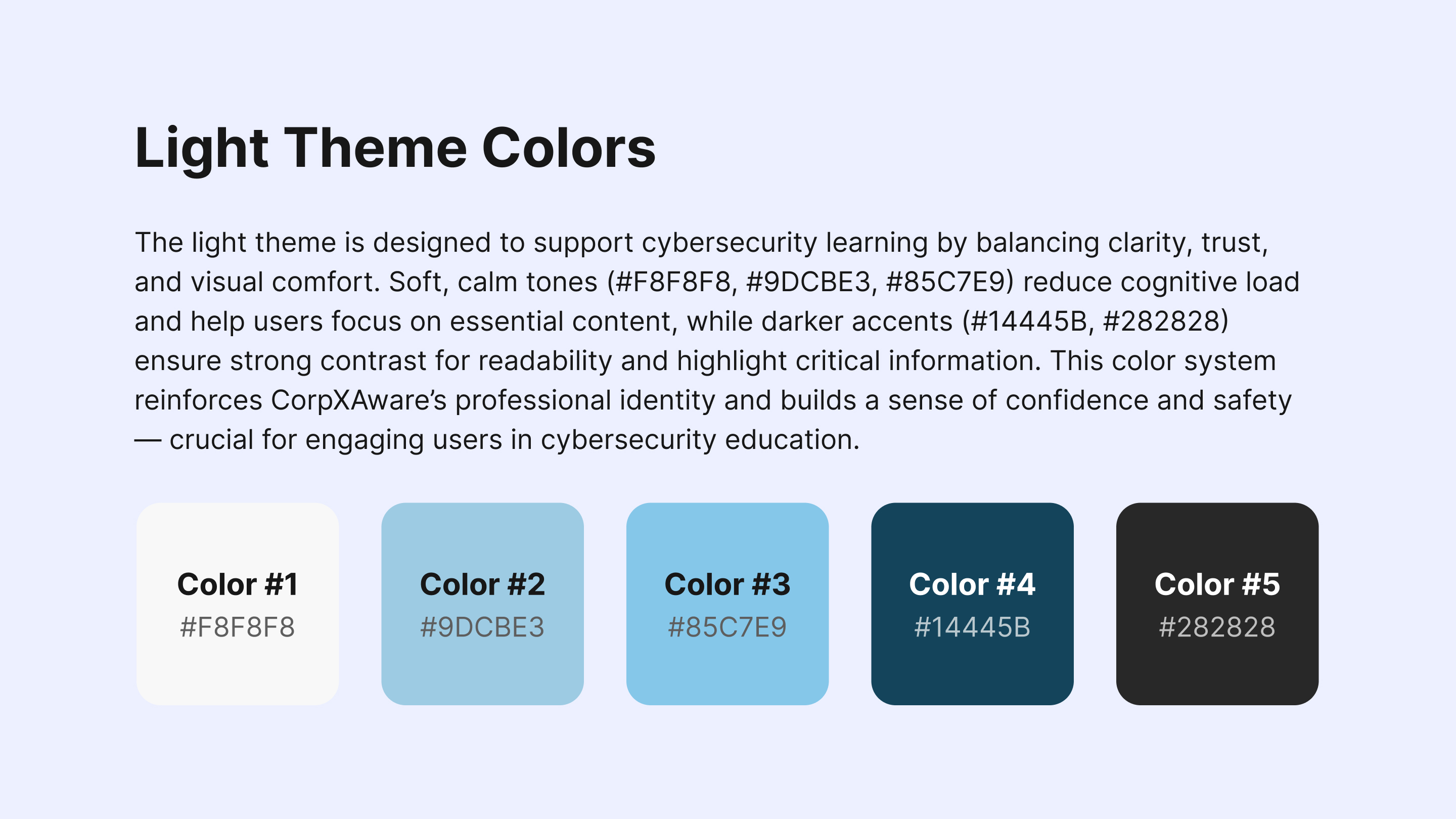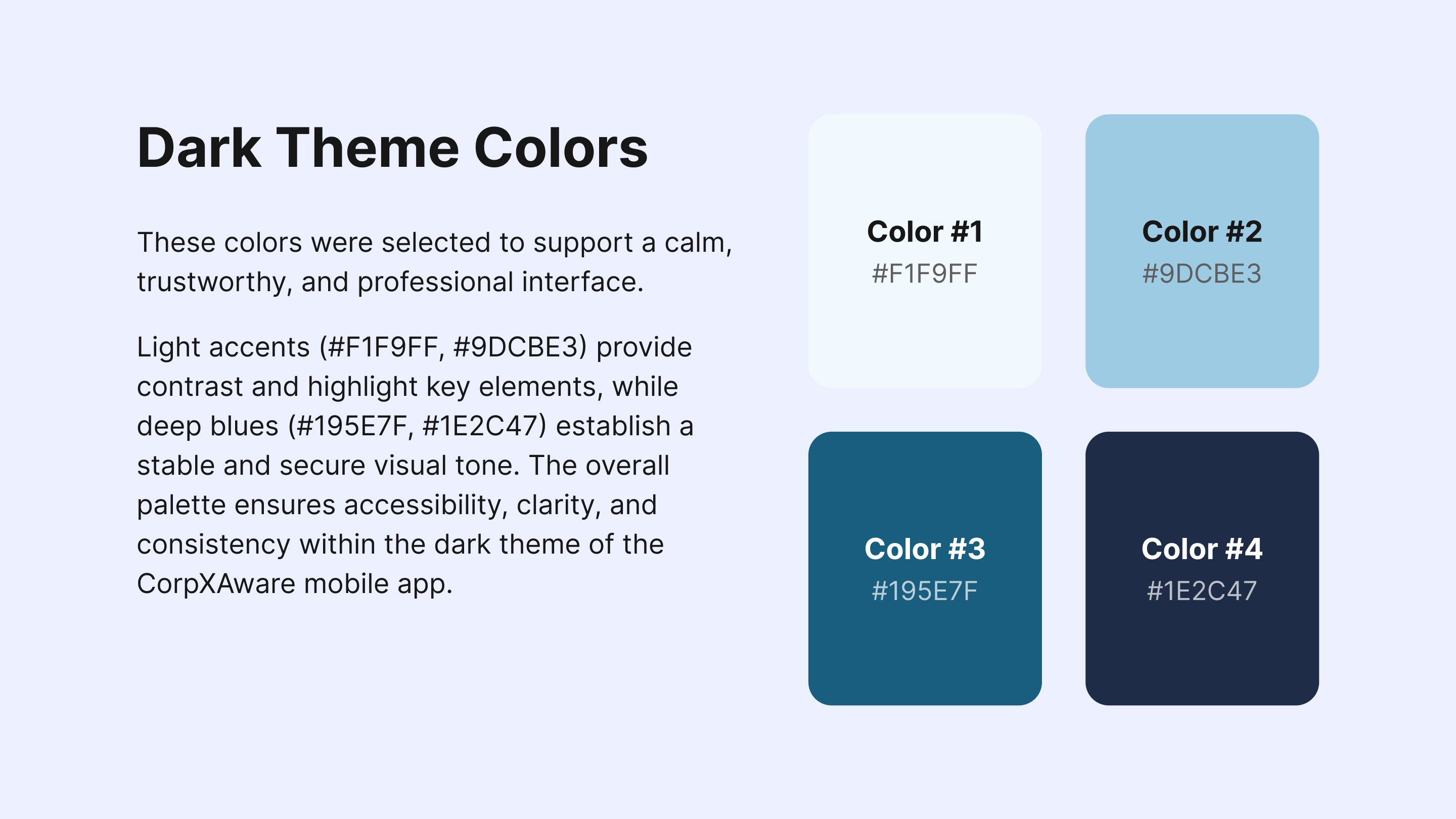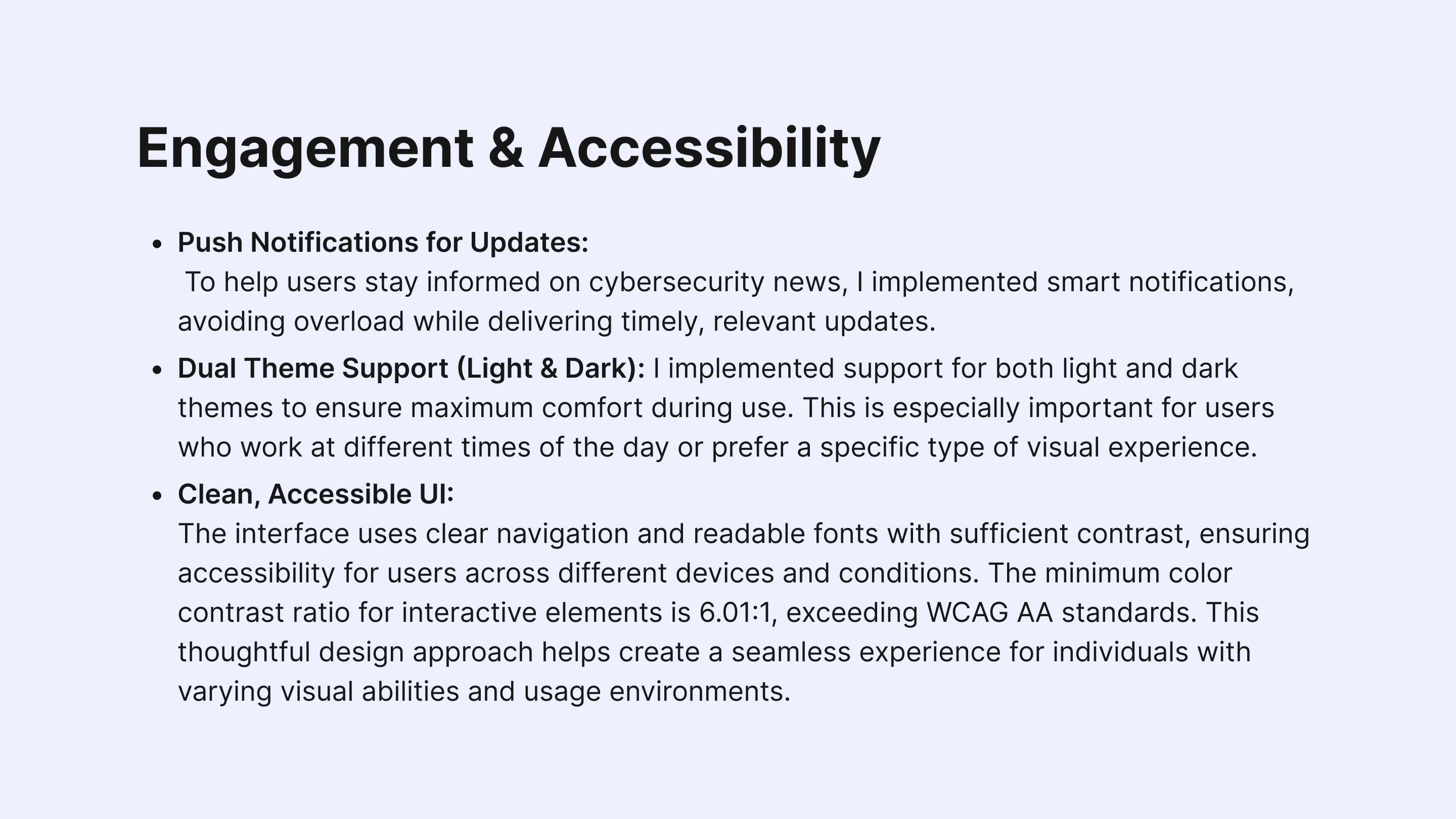 Hi Elene, thanks for your feedback. Regarding contrast — in this project, the minimum contrast ratio for elements is 6.01:1, and in most cases, it’s even higher. I follow WCAG guidelines closely, but to avoid any doubt, I’ll include these values directly on the slide.
