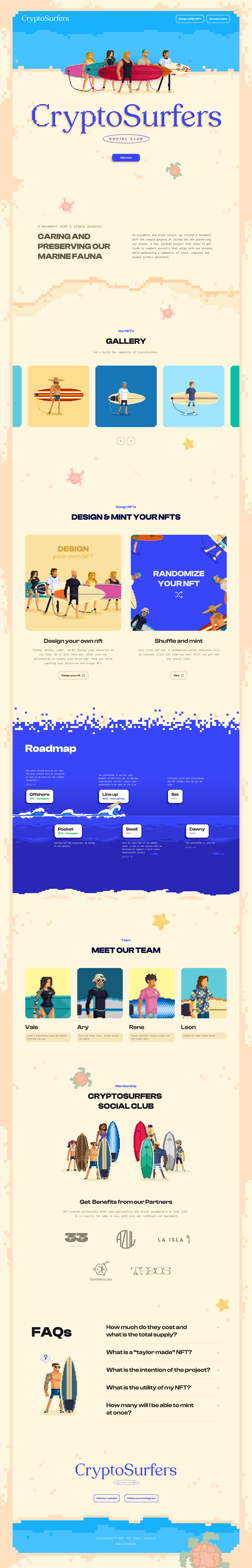 The page features a section with essential information about the project, designed in pixel art style showcasing pixel surfer characters. It also incorporates blockchain elements such as wallet connect and directs users to an NFT generation app.