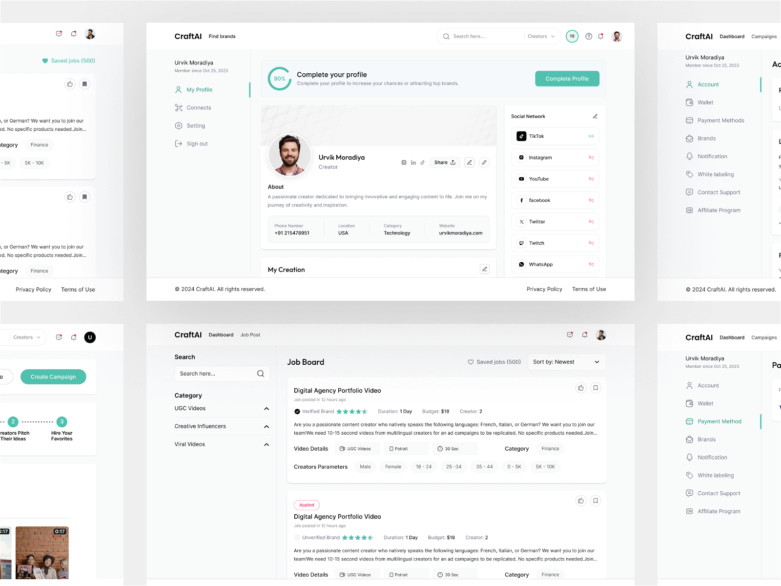 I'm thrilled to share my latest project: the CraftAI Dashboard! Designed to bridge the gap between brands and content creators, this platform is a game-changer for both sides of the influencer marketing industry. Here’s a sneak peek into what makes this dashboard special: