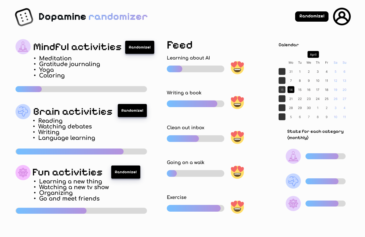 This is my first UI design project. I want it to be a system where you can randomize different things to do instead of mindless scrolling. I choose the pixelated font because I wanted it to have some game UI elements to make it seem more enjoyable. I also wanted stats so you could track your progress on achieving certain tasks. The randomize buttons beside the elements would only give you things from that element while the randomize button at the top would give you an activity from all of the categories. Any feedback will be much appreciated as I am trying to learn UI design :)