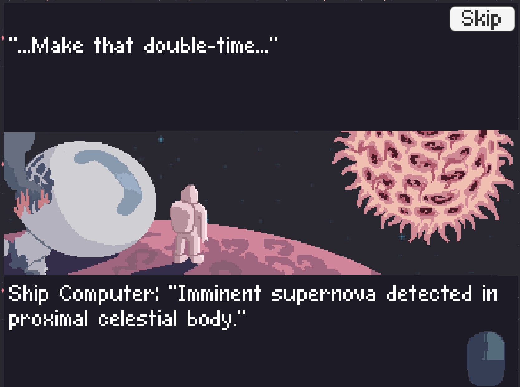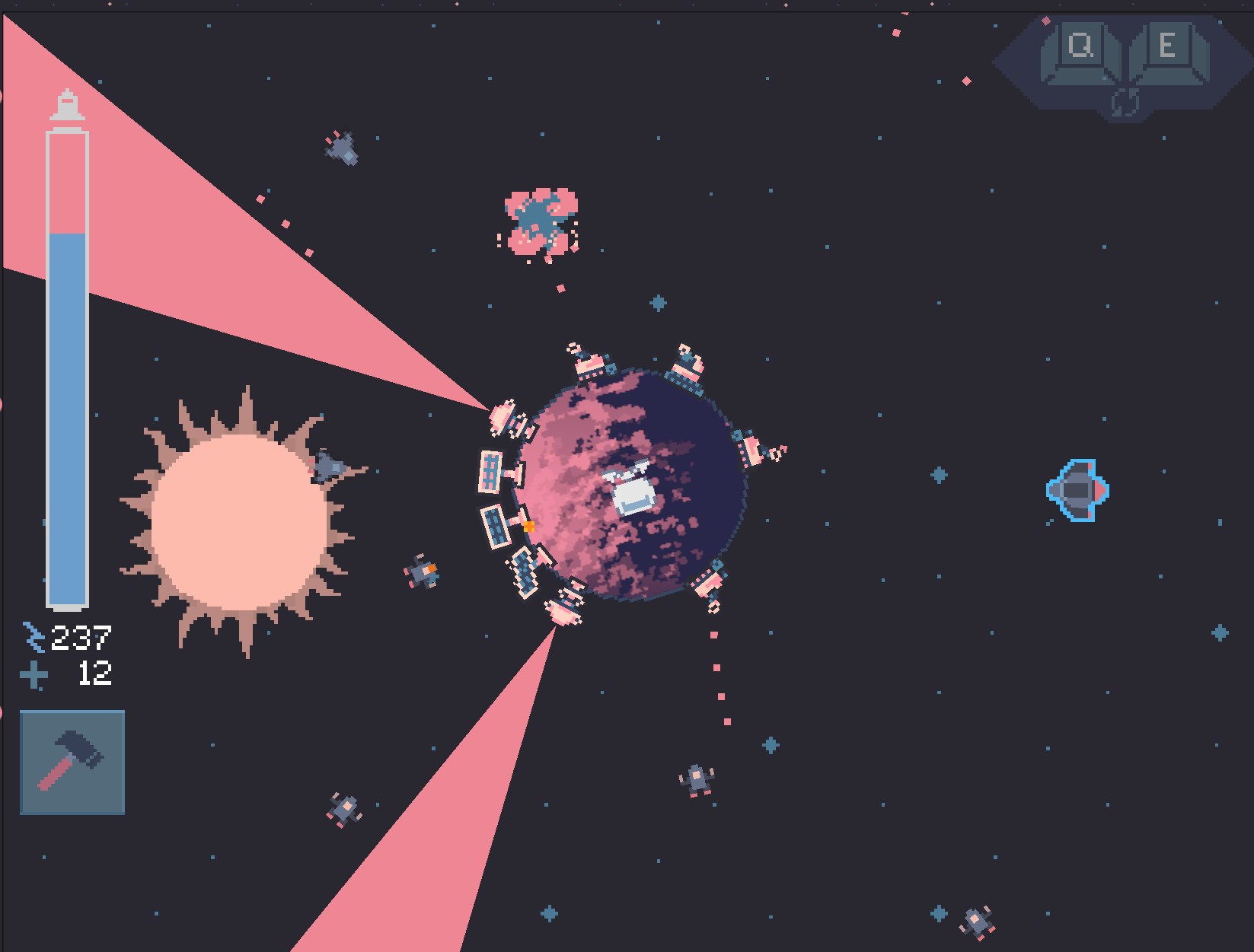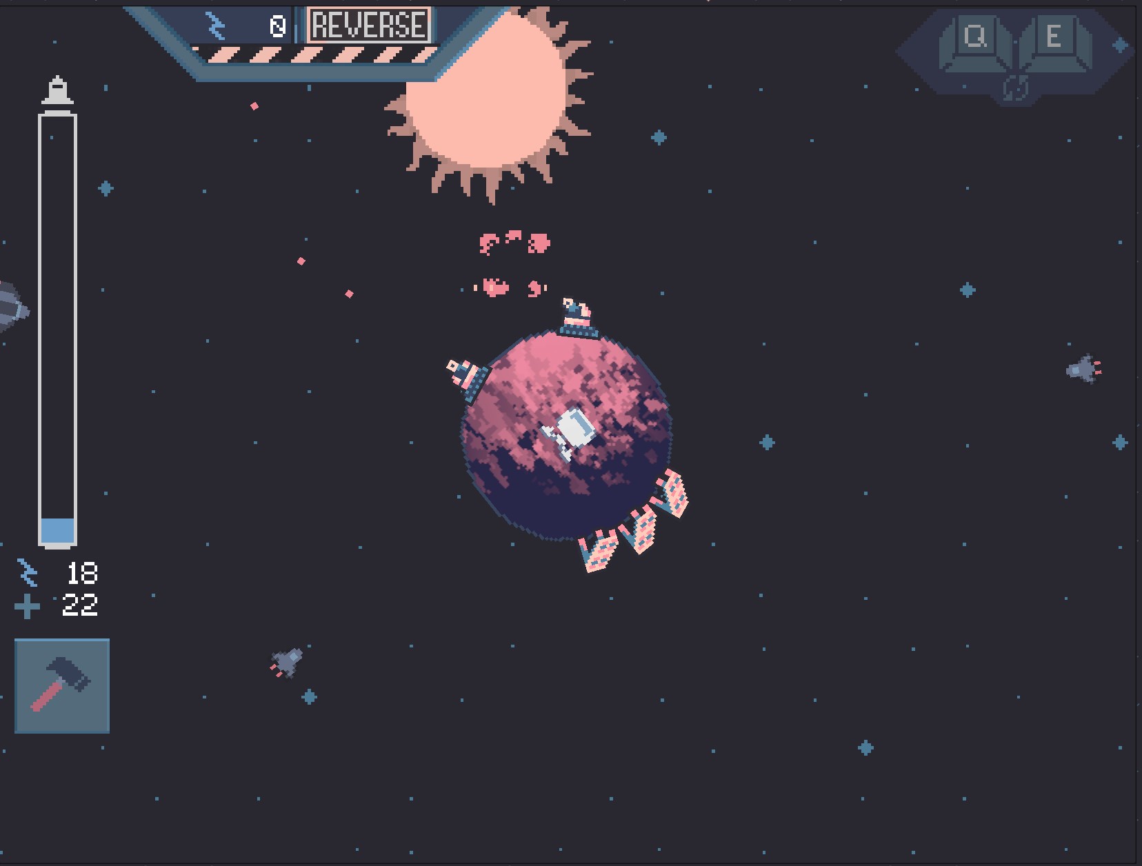 Once we received the theme of "loop", we brainstormed a few ideas - landing quickly on a space tower defense game that incorporated both a time loop and a visual loop for the gameplay. We settled on the concept of a time loop where the player had to escape a planet, fighting off enemy ships before the sun exploded and became a black hole. We decided on the main gameplay being the main character building solar panels to harvest energy and turrets to shoot away enemy ships, and that the sun would serve as the game timer. The player would be able to set back time before the sun exploded, giving the player more time, but would result in harder gameplay over time. I started creating documentation for all of the gameplay elements and requirements. The other artist and I divided up the sprites needed, and the dev jumped into game design with placeholder elements.