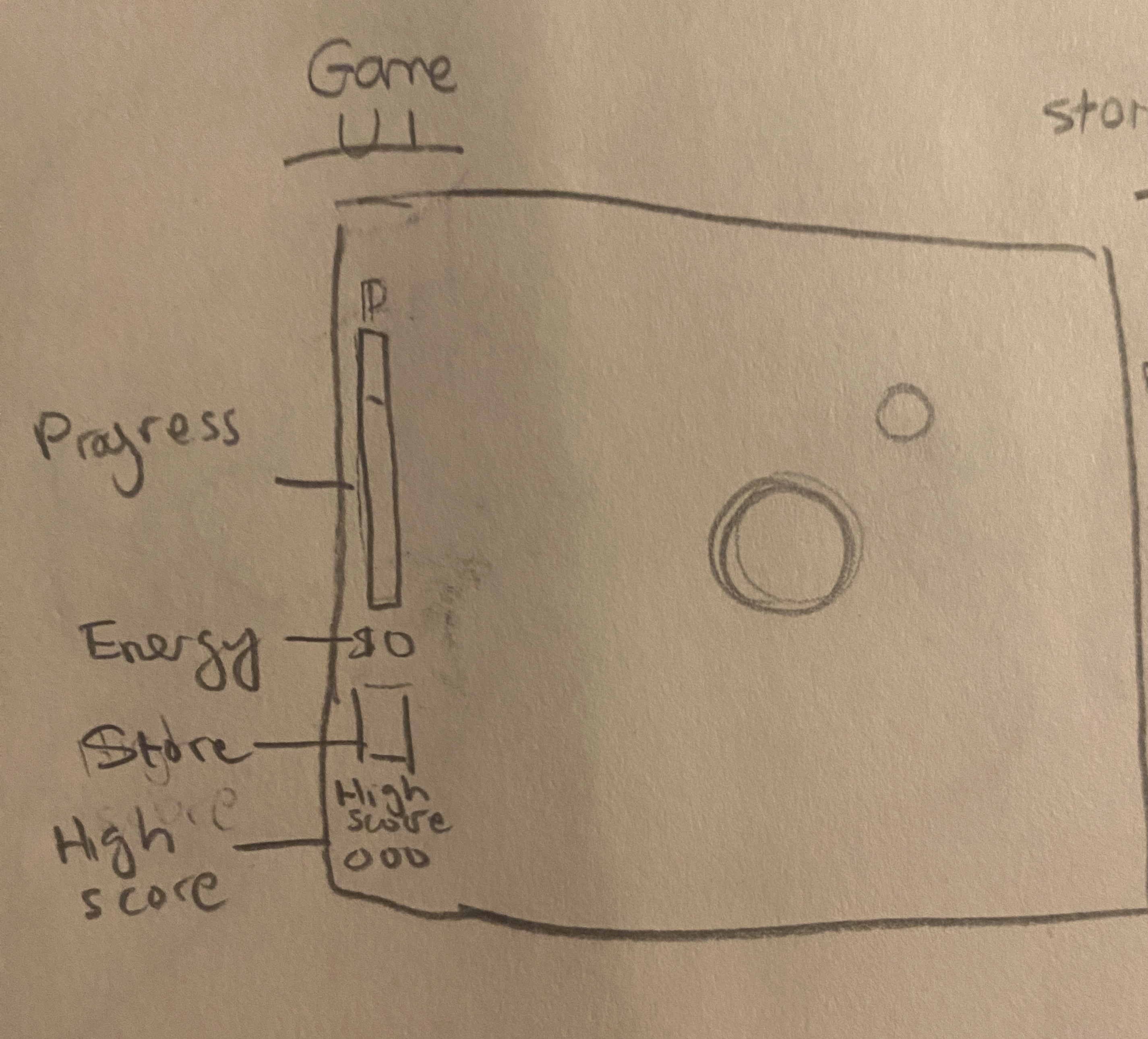 The UI needed to consist of a progress bar, a measure of energy points available, the build store icon, and we considered some kind of high score element but decided against it. We also later decided to give the planet a health measurement