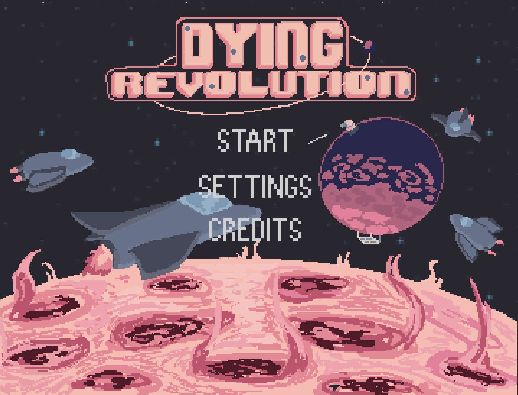 Screenshots of the final assets and product design for Dying Revolution. We submitted the game before deadline: with polished assets, music, sound effects, custom letting, and animation. Dying Revolution is available to play for free in browser at the link below: