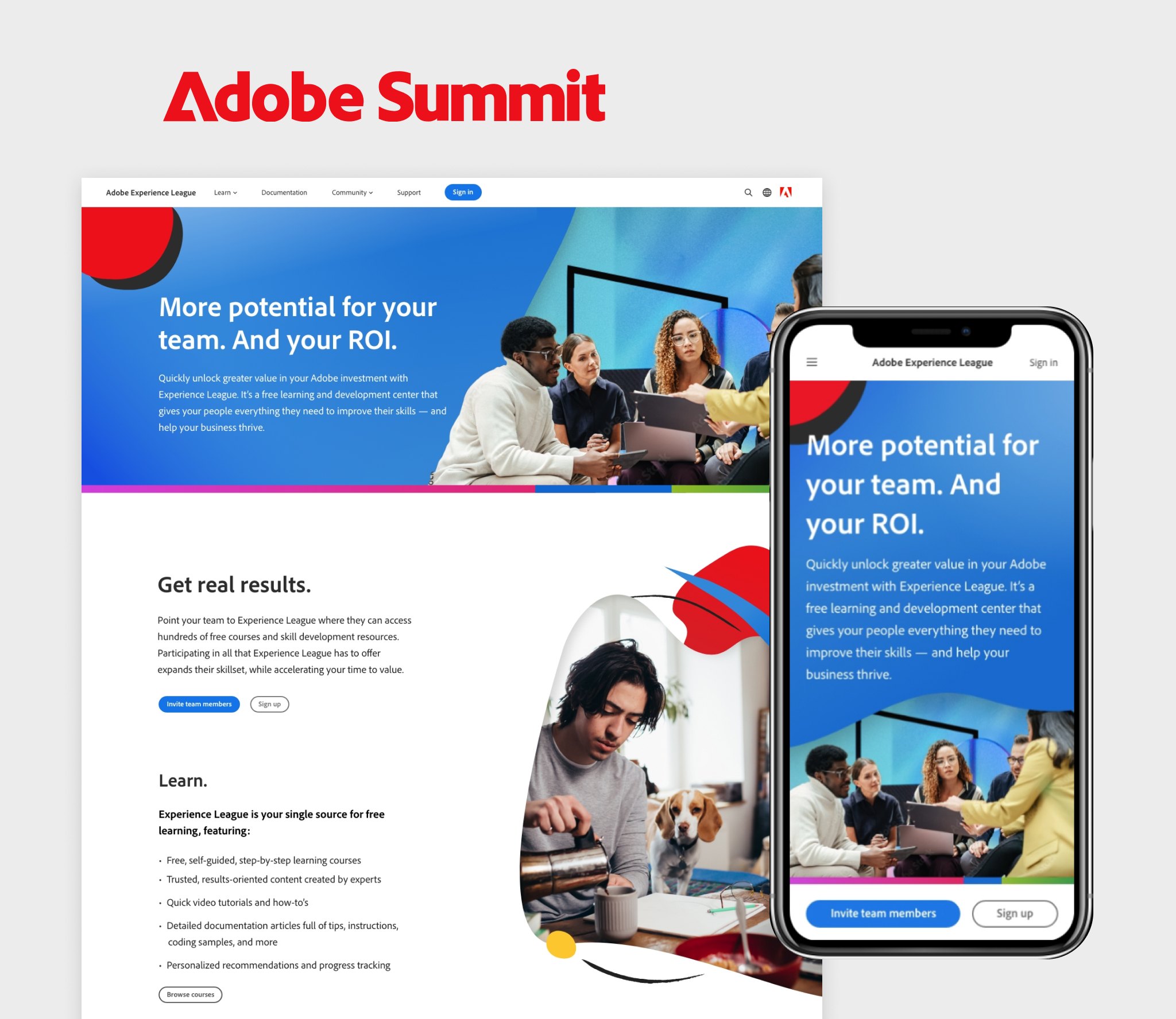 Taking inspiration from the event promo design that year, we stood up a landing page to promote the awareness of Adobe's Experience League resources at the event. They needed a mobile-first page to make it easy for attendees to spread the news to their colleagues.