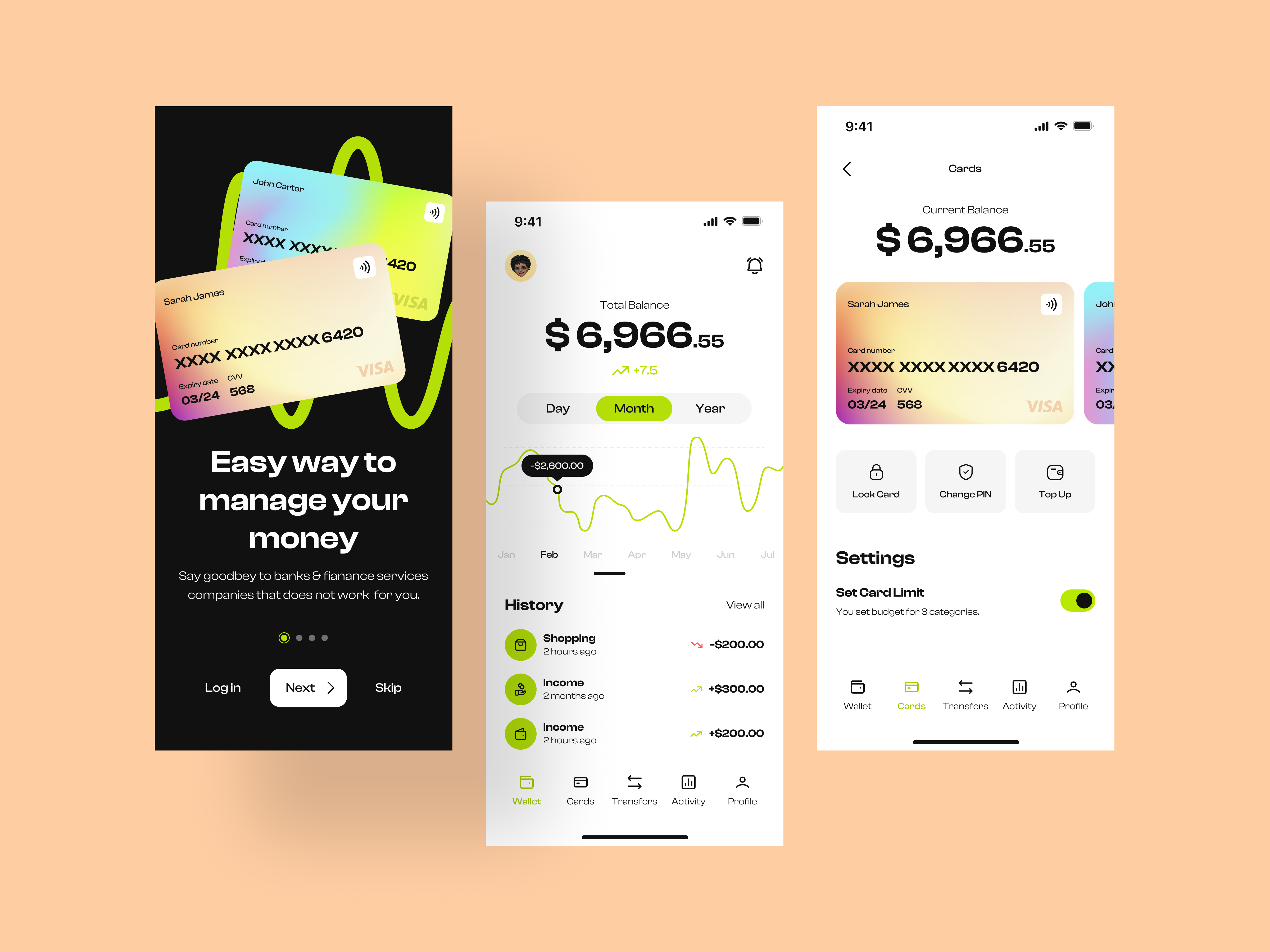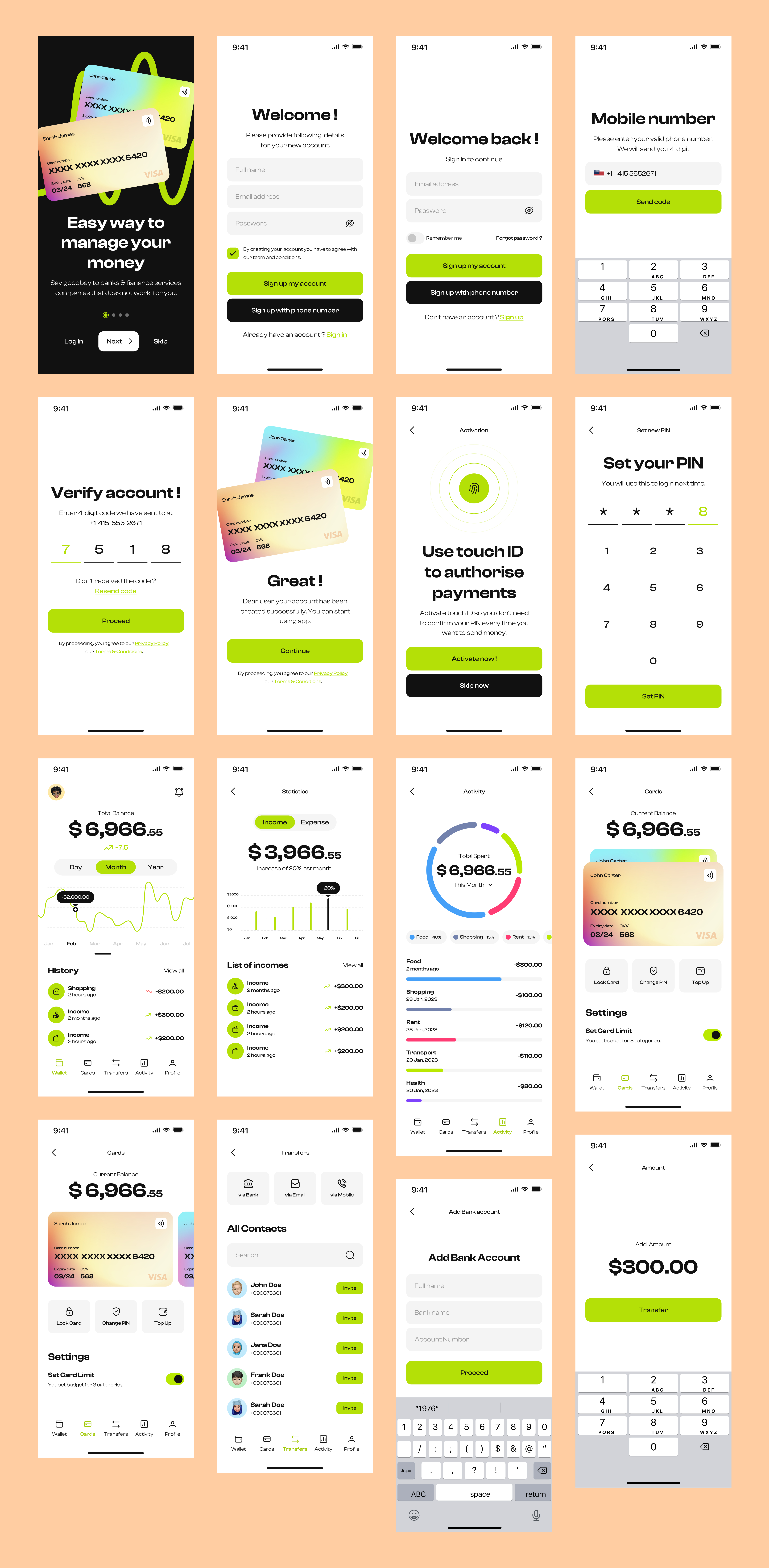 I like this fun and vibrant design for something that some may consider "boring finance" work. This reminds me a lot of the Revolut app, but a brighter option with its own flavour. Some super features in here, I like that "Lock card" and "Top up" is displayed as a quick link, because these actions can be urgent ones and usually you want it a click away and not bother with too much navigating around before getting to it. I like the spending categories, but I do expect to see a option as "other" because usually these apps can't perfectly categorise every spend. At some points I found the font too thin so I wonder how this looks on an actual mobile screen. Other than that, looks like a simple to figure out app and a nice polished design.